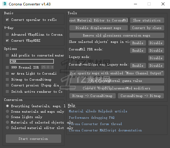 coronaConverter_v1.43主要用于3dmax场景中的材质、灯光进行转换为Corona渲染器支持的材质灯光,非常的方便,解决了大多数朋友从VR到CR过度转换的一个难题。本网站提供了coronaConverter_v1.43汉化版与英文原版,免费分享大家使用。