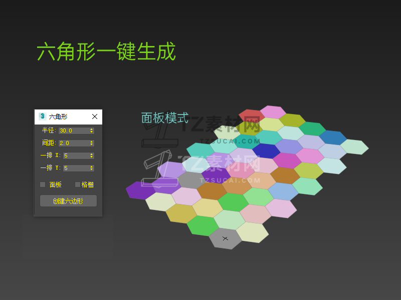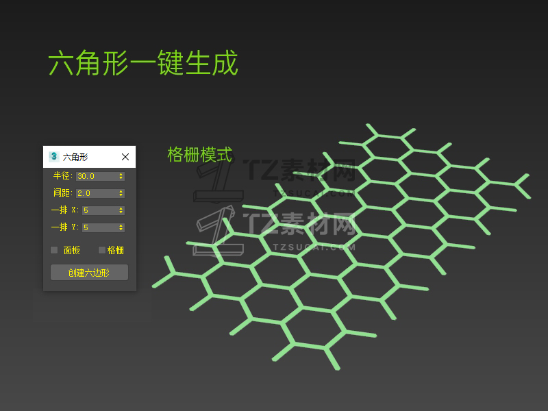 3dmax一键生成六边形脚本插件,可以一键快速生成六边形,可调整参数和模式生成需要的六边形。使用方法:拖入3dmax界面即可使用