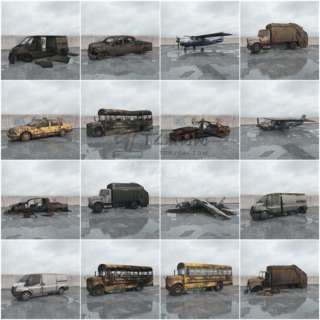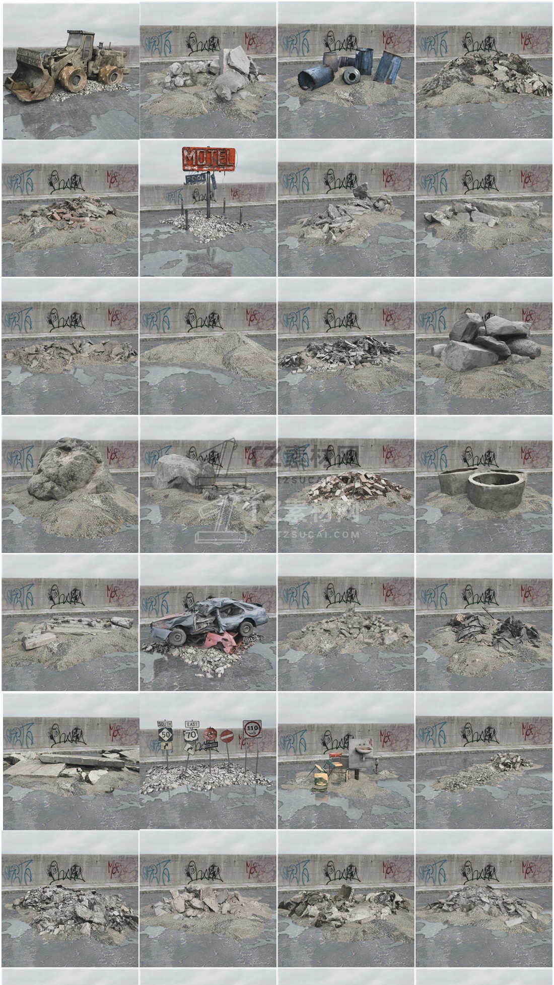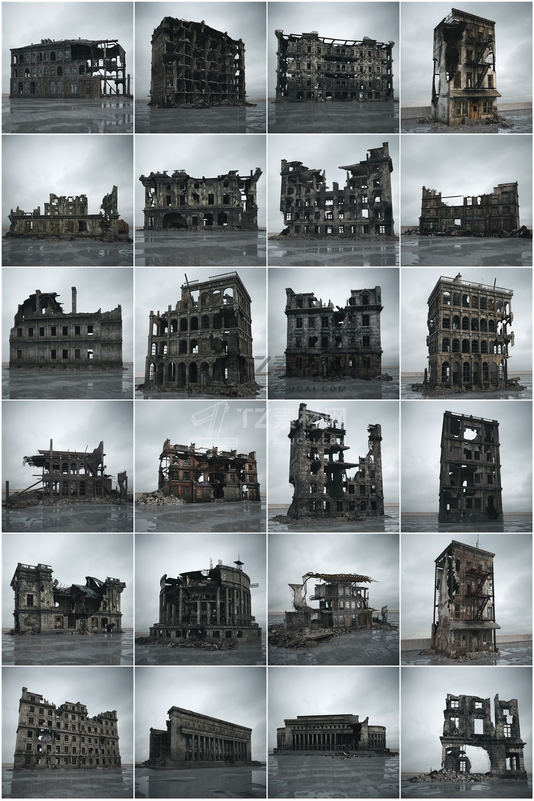 Archmodels vol. 165包含108个坍塌破碎楼房建筑模型,使用用于游戏,电影特效场景中,包含所有的贴图等