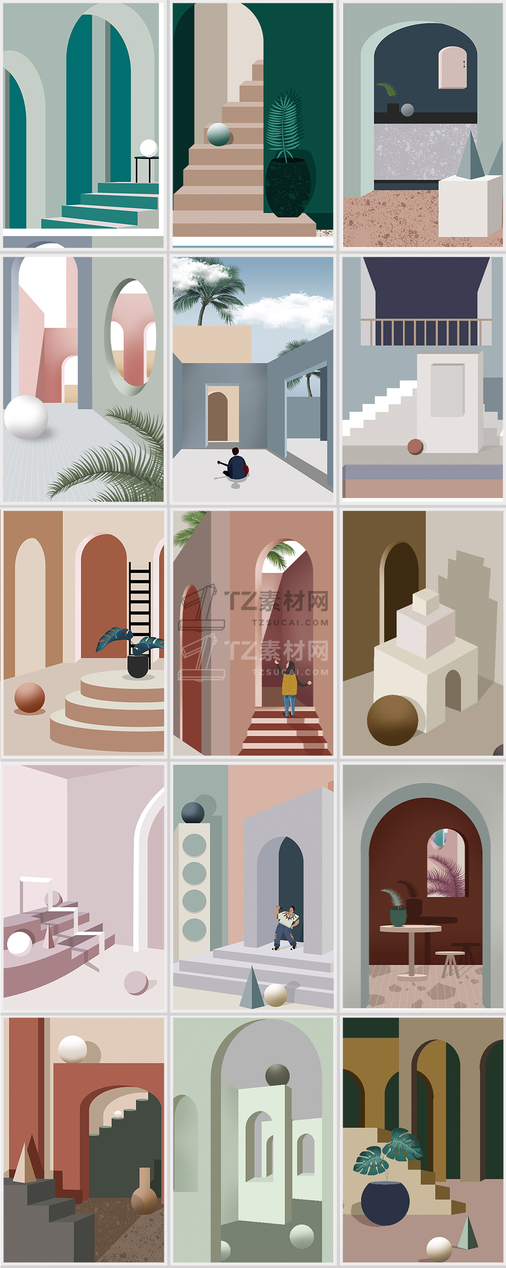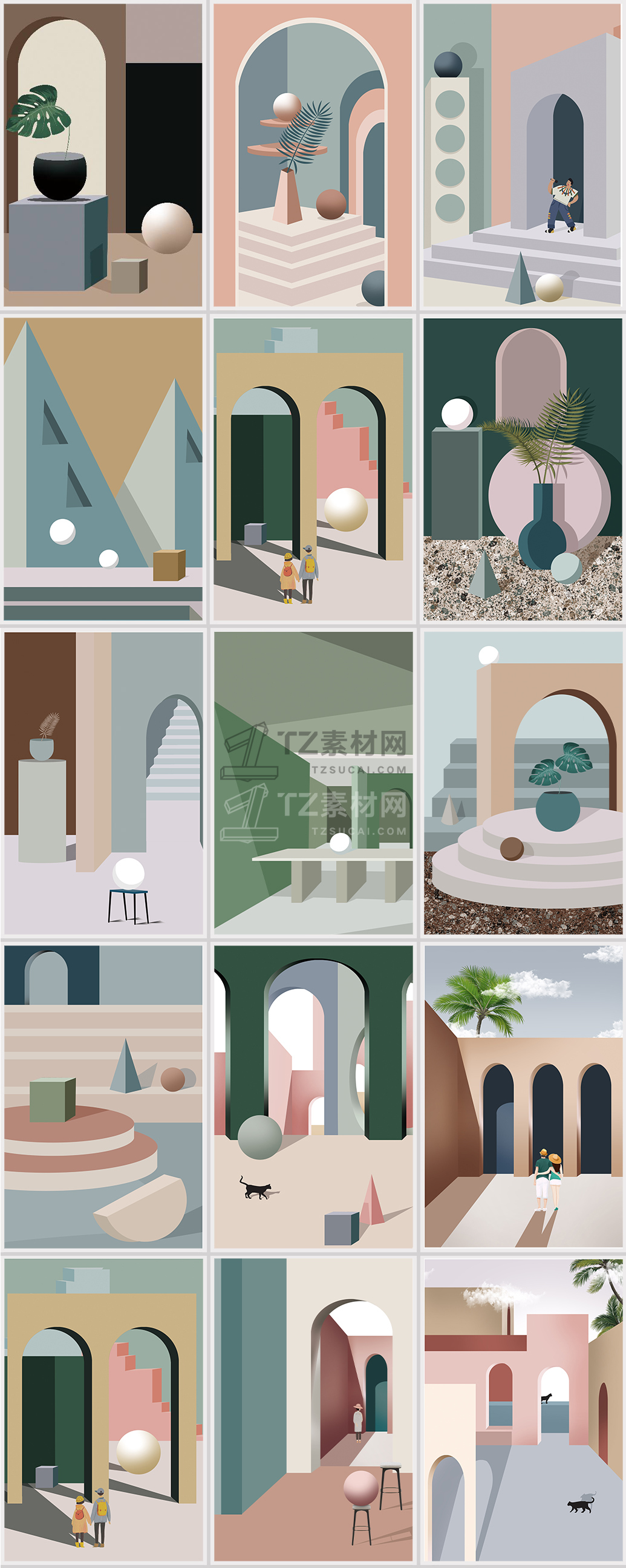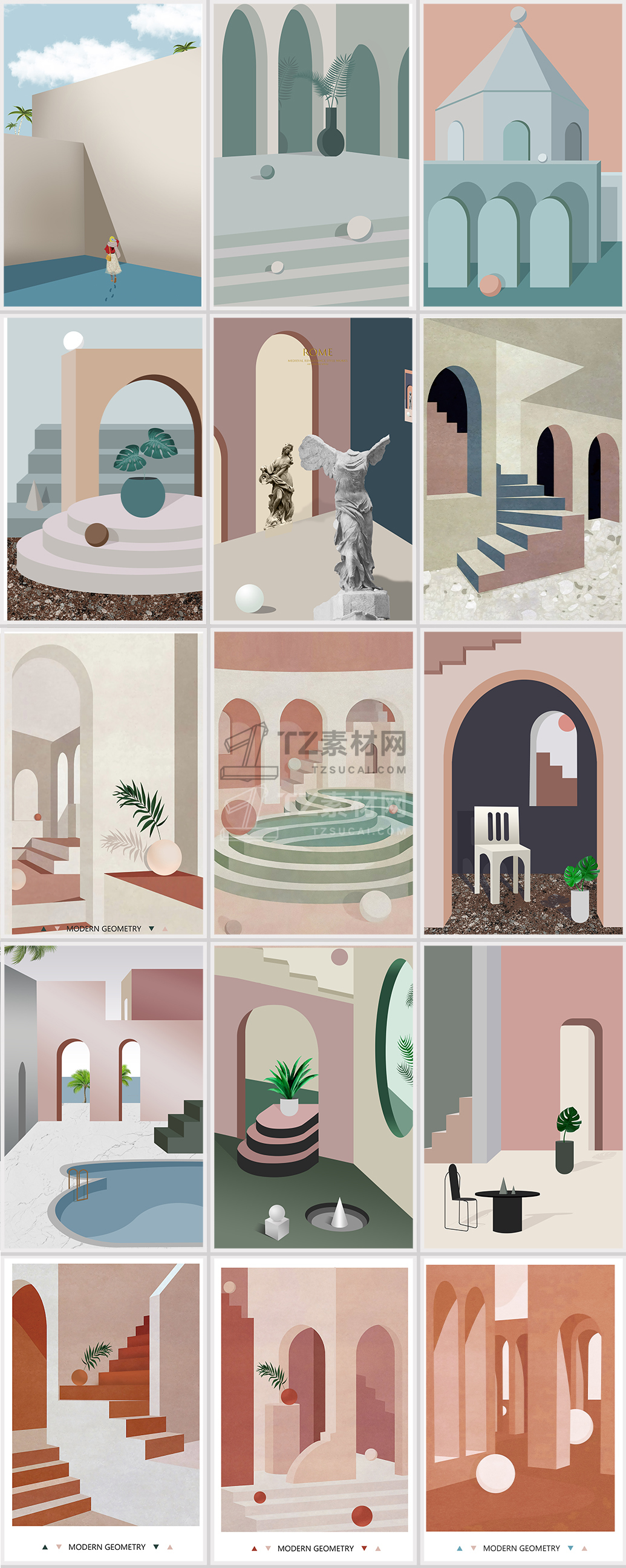 莫兰迪色系几何建筑沙发背景装饰画贴图素材