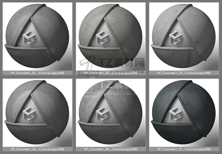 精心制作Vizpeople -Concrete室内外常用混凝土CORONA物理PBR材质球:即拖即用;支持Preject Mananger;可与VRAY互相转换;专为室内设计师和建筑可视化制作,贴图已转换为2k适合商用。(如需8k可自行在平台按标题搜索贴图,在“maps”文件夹替换即可)