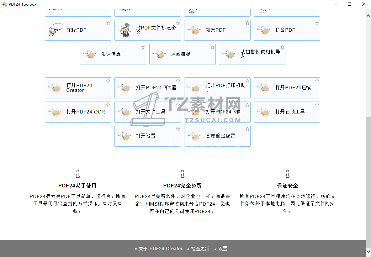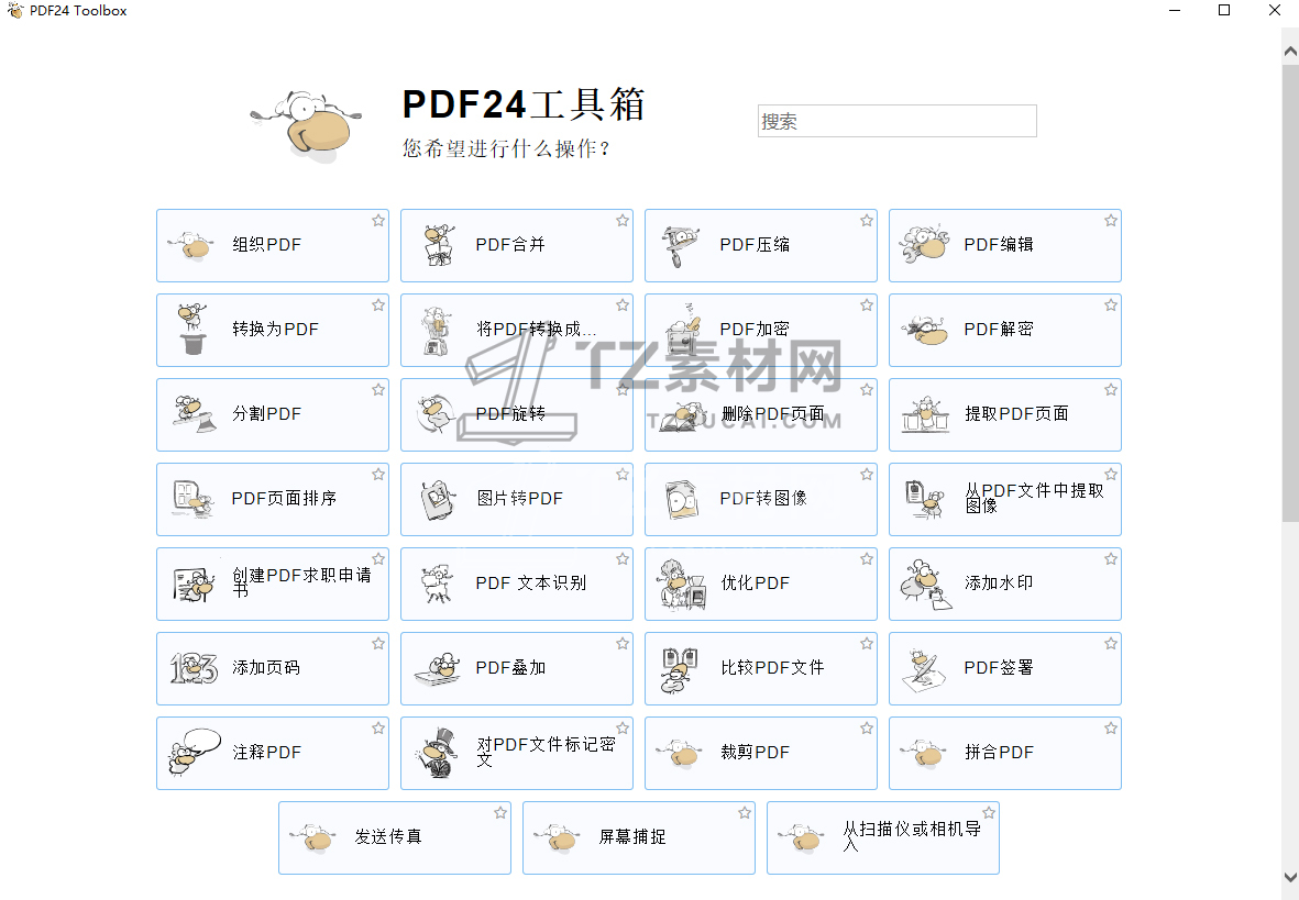 PDF24 工具箱,包含了很多PDF文件处理相关的工具:PDF文件打开预览、PDF合并、PDF压缩、PDF编辑、PDF转换、PDF加密、PDF解密、分割PDF、PDF旋转、删除PDF页面、提取PDF页面、PDF页面排序、图片转PDF、PDF转图像、从PDF文件中提取图像PDF文本识别、添加水印等等。非常齐全且实用,处理PDF文件,用 PDF24 工具箱就够了!