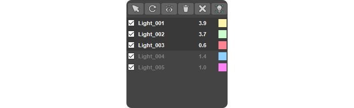 左鼠标单击+ Alt键按下:从工具中删除选定的光。