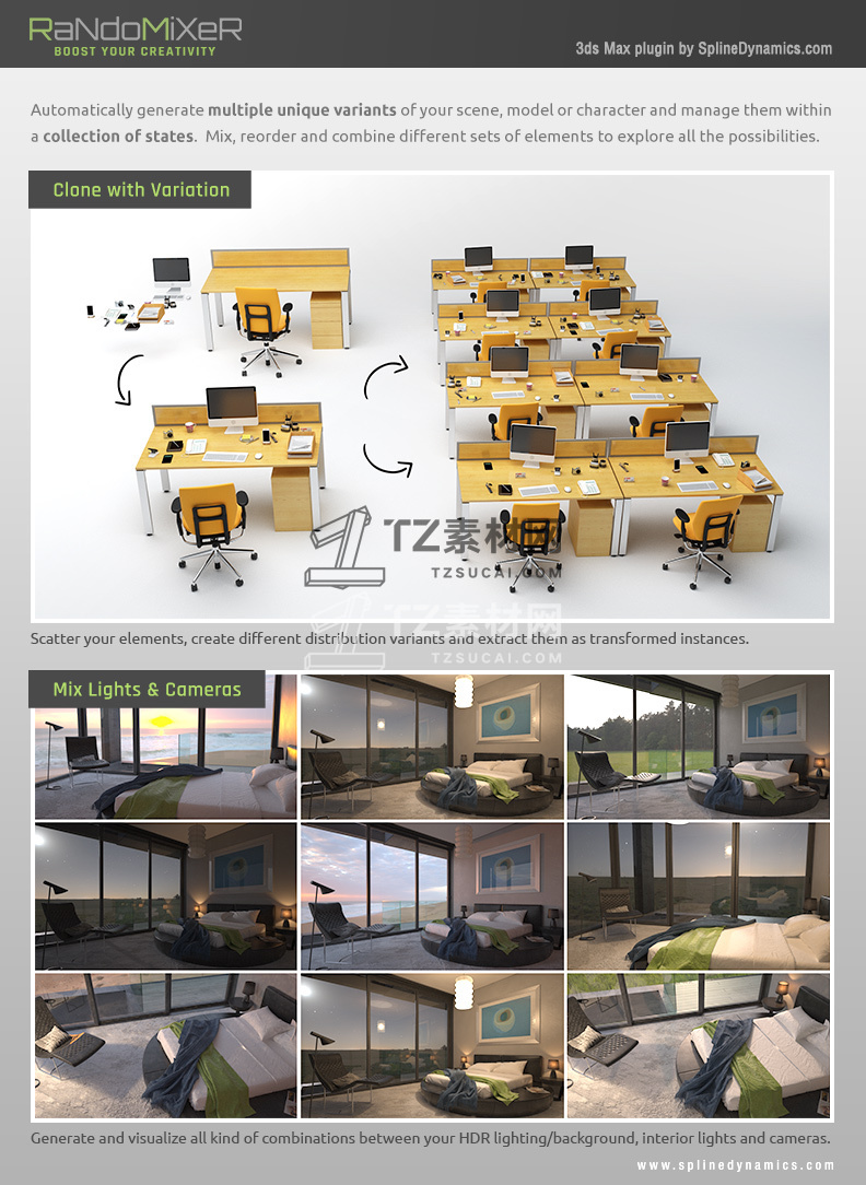 RandoMixer 是一个功能强大的 3dsMax 插件,可以自动生成场景、模型或角色的多个变体,并在状态集合中管理它们。