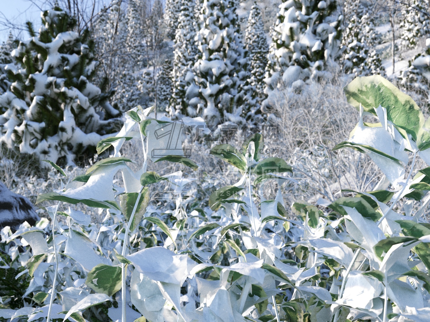 包含冬天里被雪覆盖的多种植物树木、灌木等3D模型,3DS MAX格式,需要Forest Pack Pro 5.4.0插件或更高版本,支持Corona和Vray渲染器,包含贴图材质