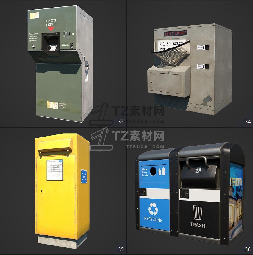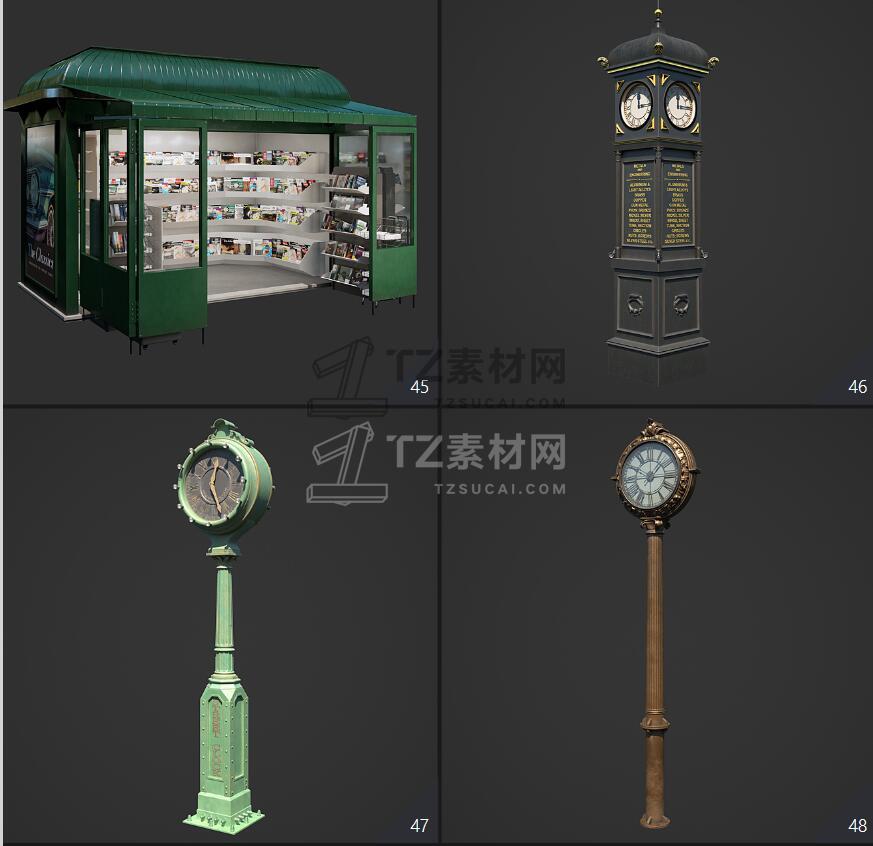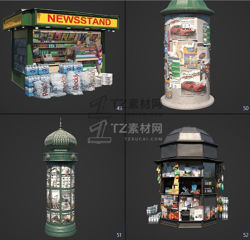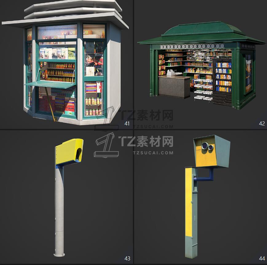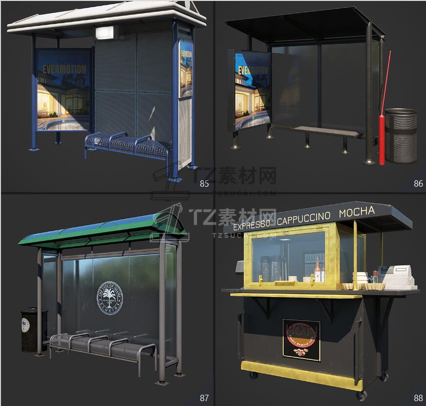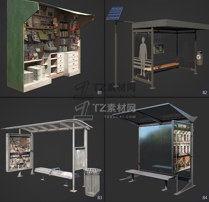 Archmodels vol. 246包含96个街道室外商店招牌公共设施等3D模型,比如商店广告牌、垃圾箱、报亭、广告柱、栏杆和建筑元素、公共交通站等,3DS MAX格式,Vray和Corona渲染器,包含贴图材质