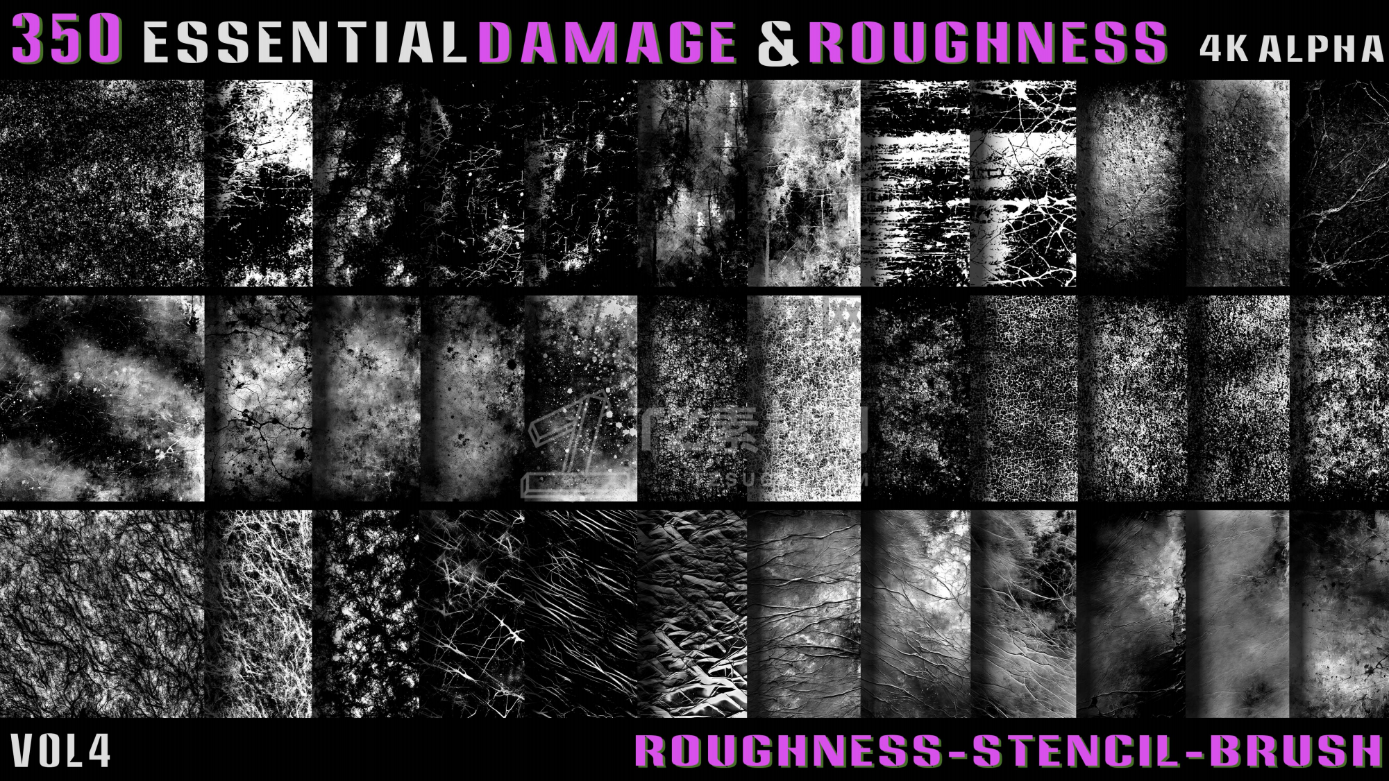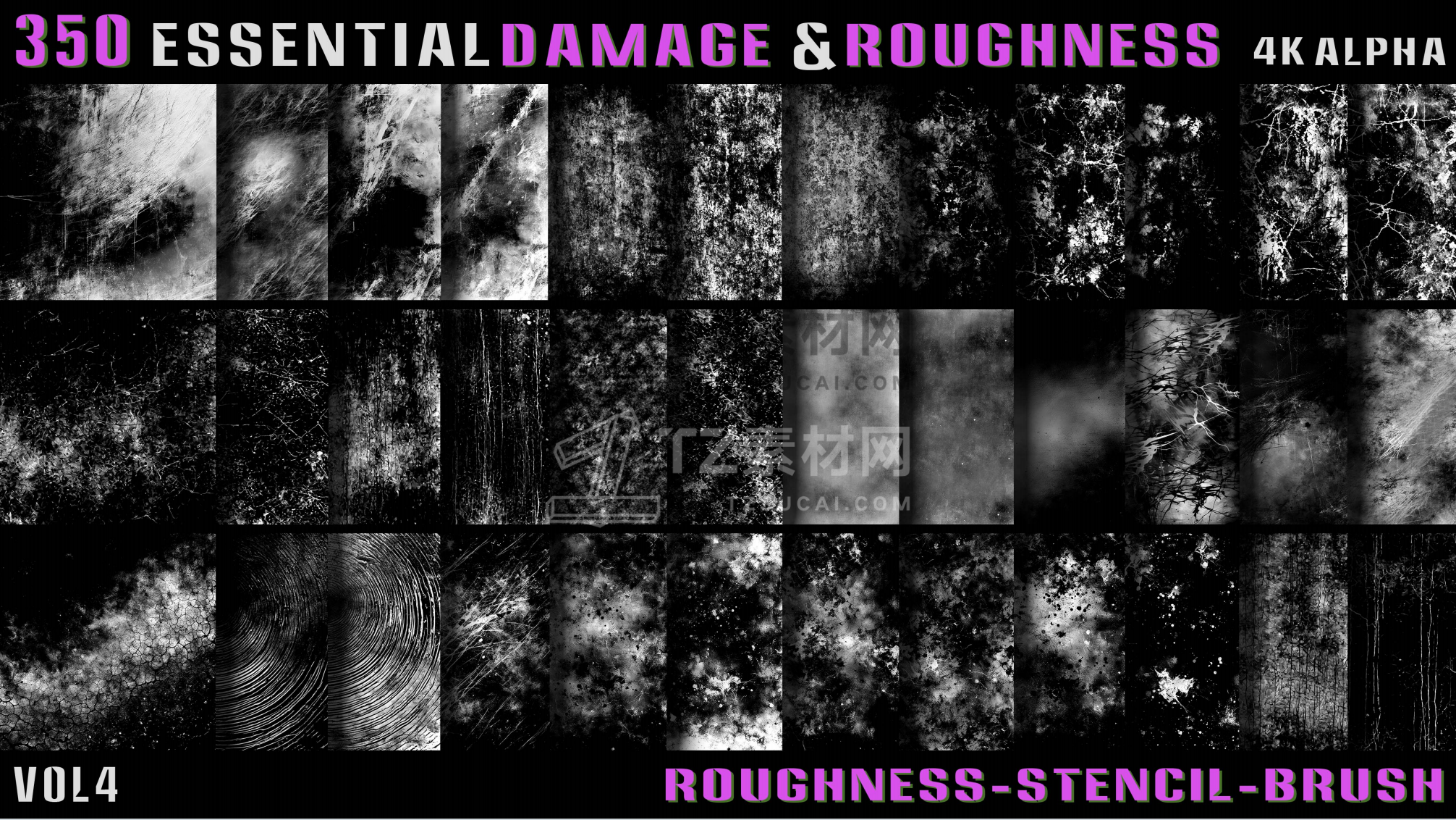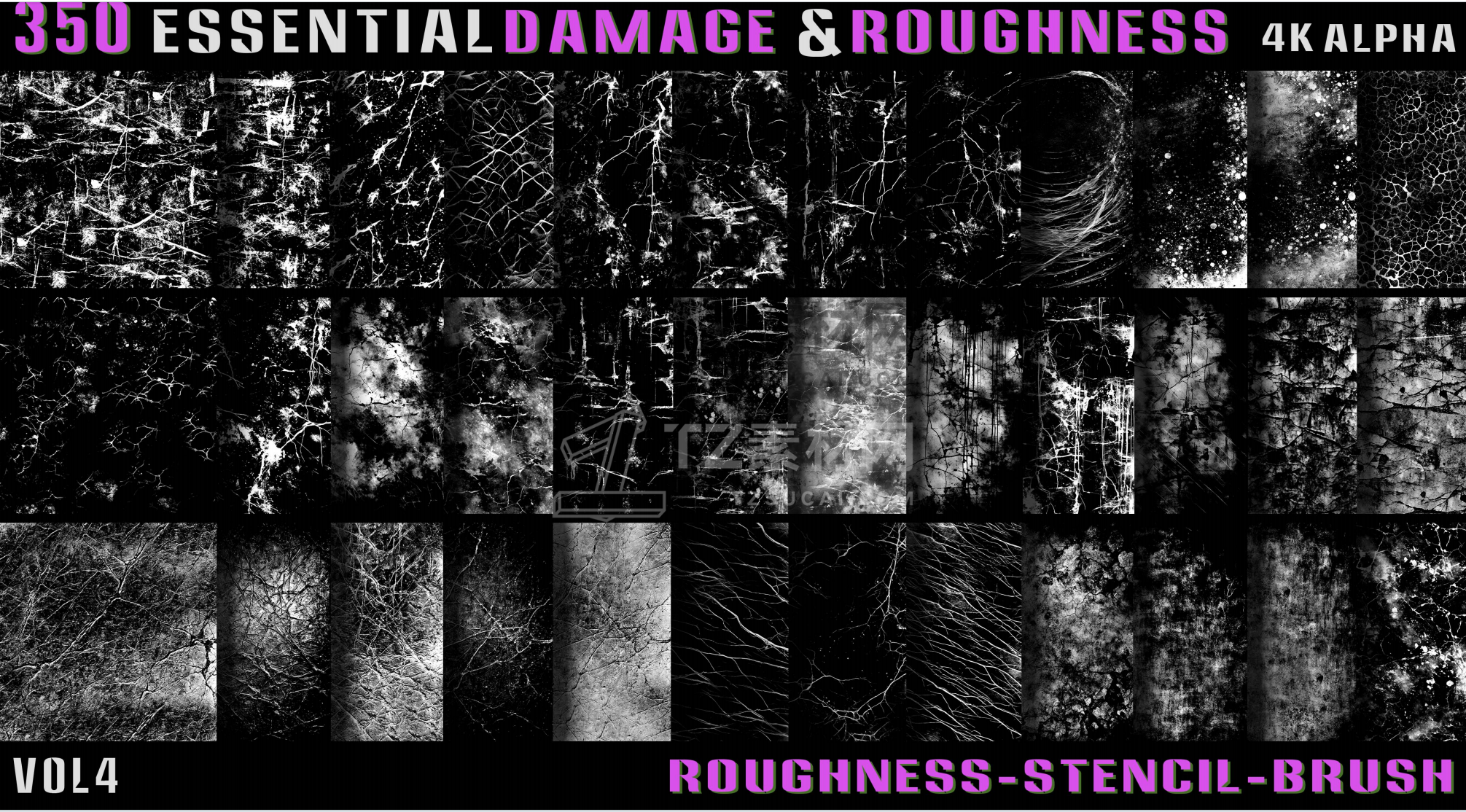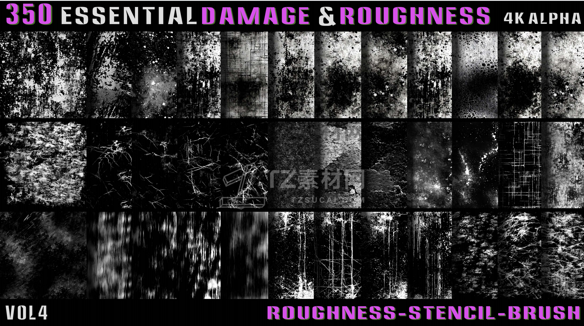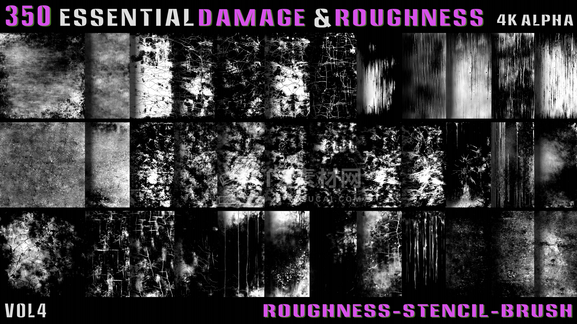 一共包含350张图片素材,包括裂痕、污迹、划痕等多种破旧效果,PNG格式,4K分辨率