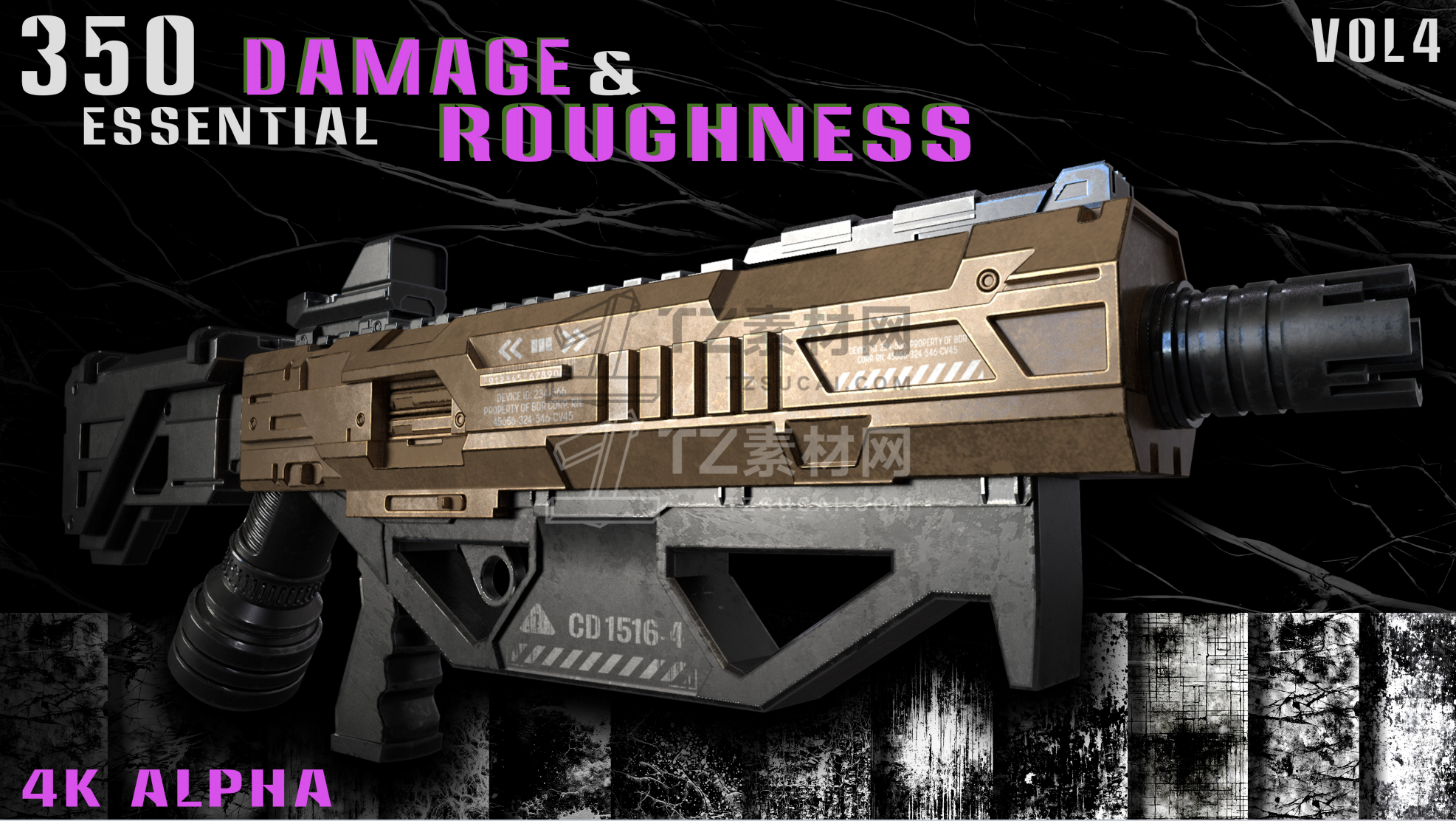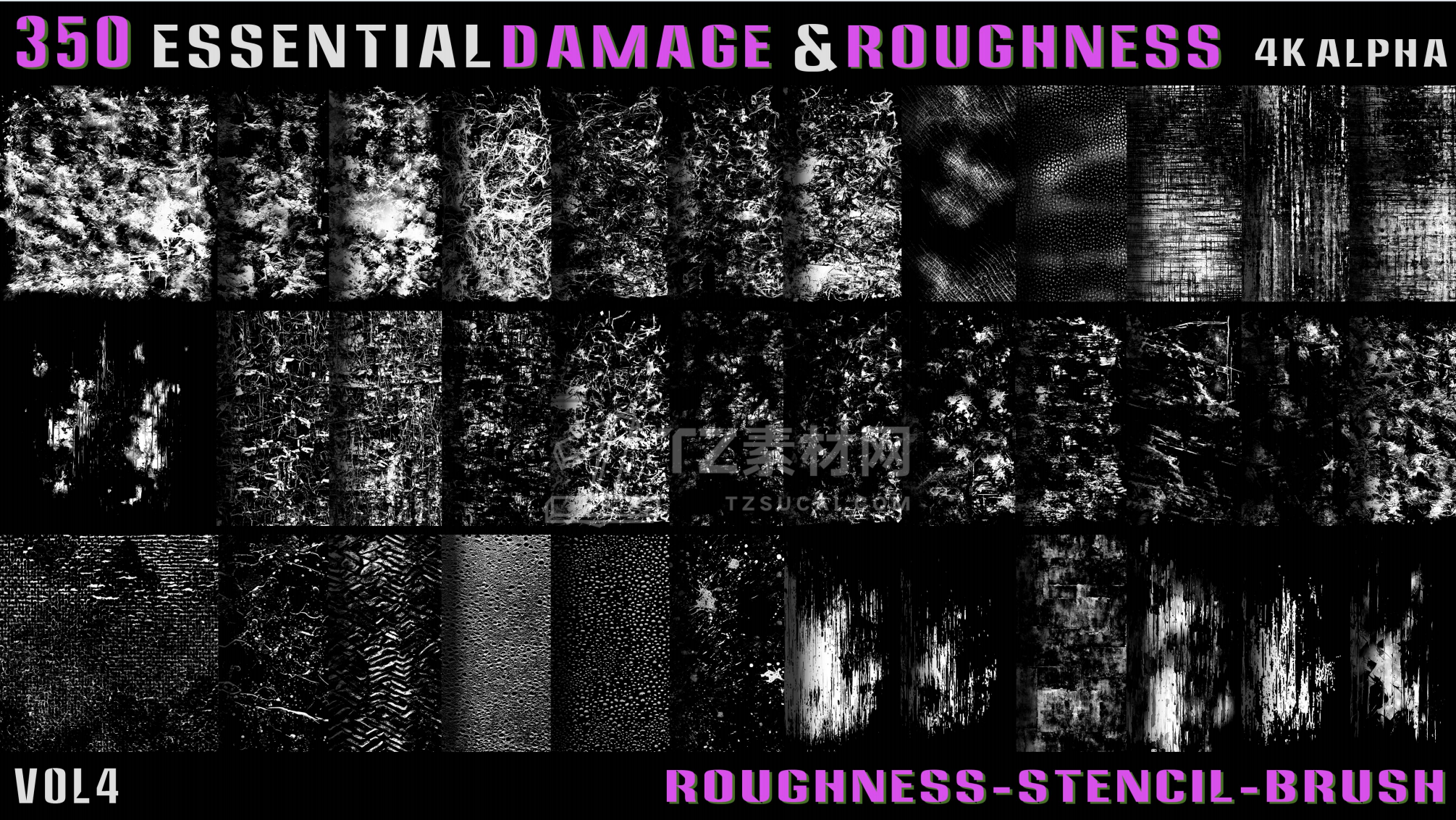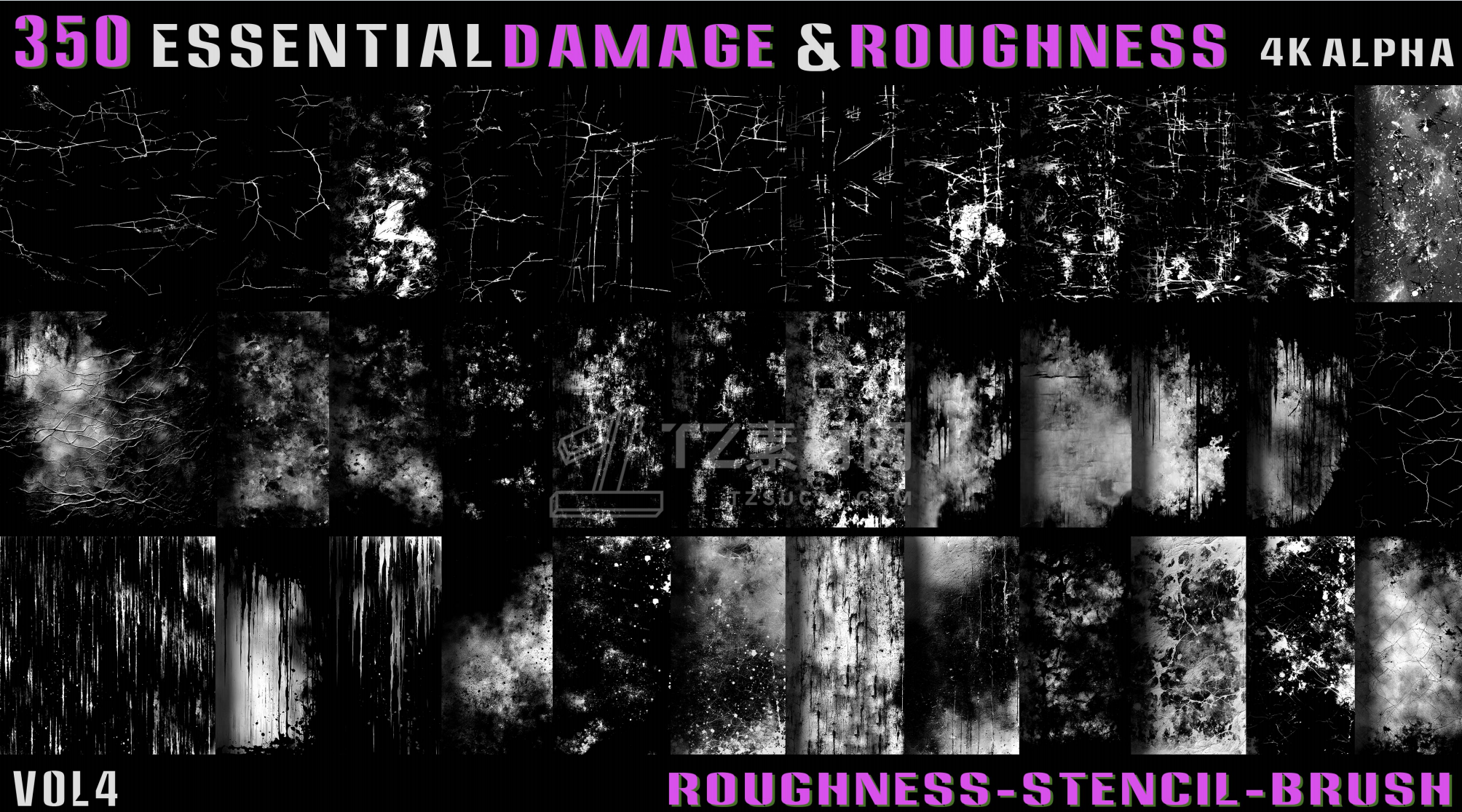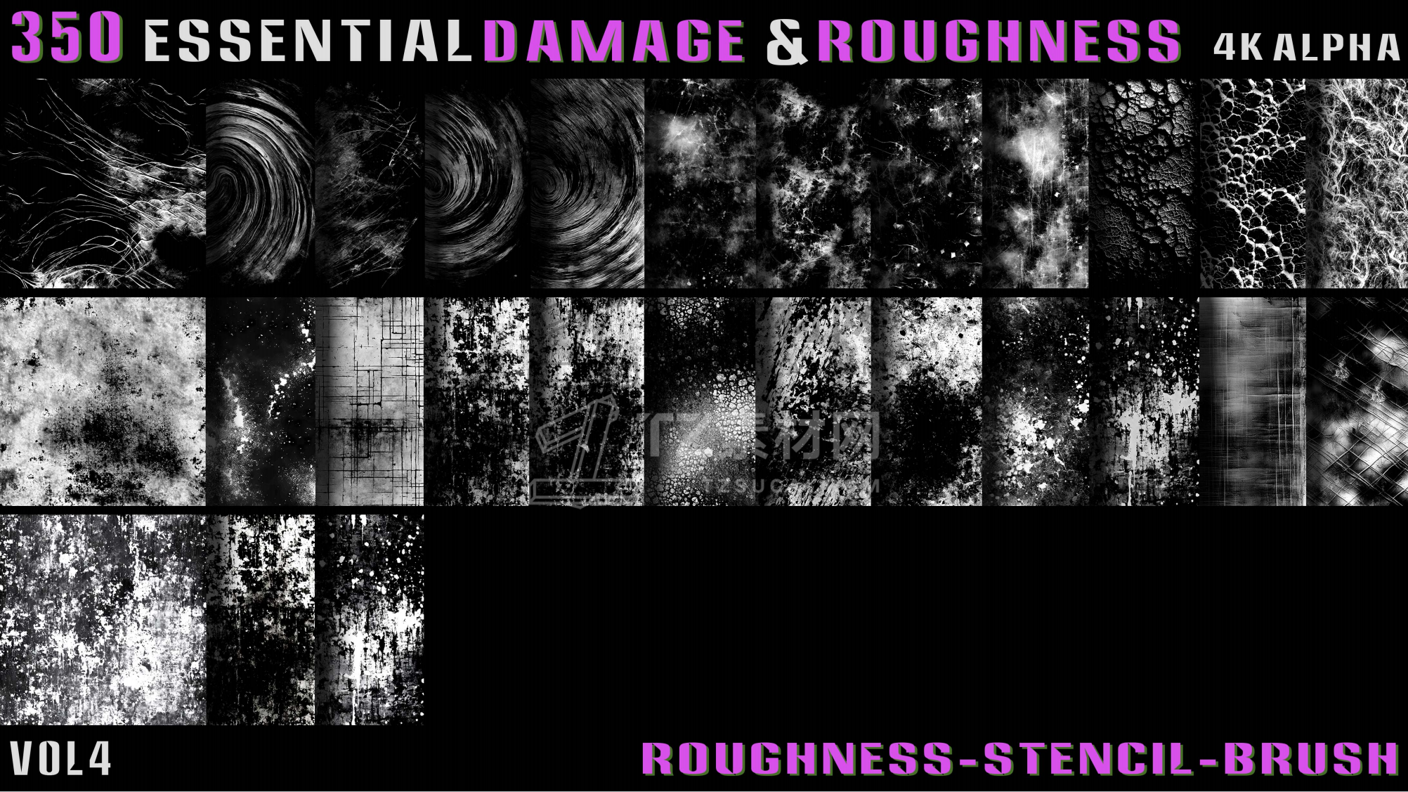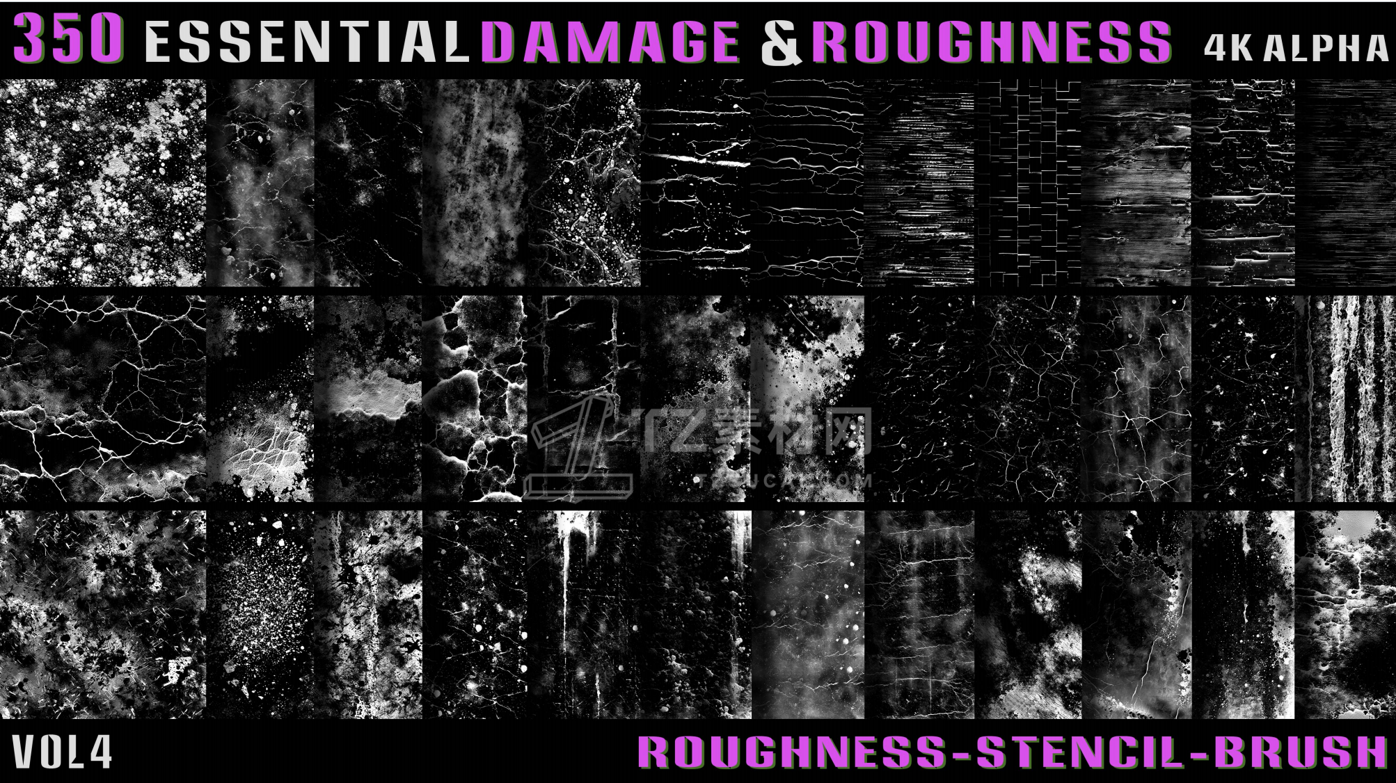 一共包含350张图片素材,包括裂痕、污迹、划痕等多种破旧效果,PNG格式,4K分辨率