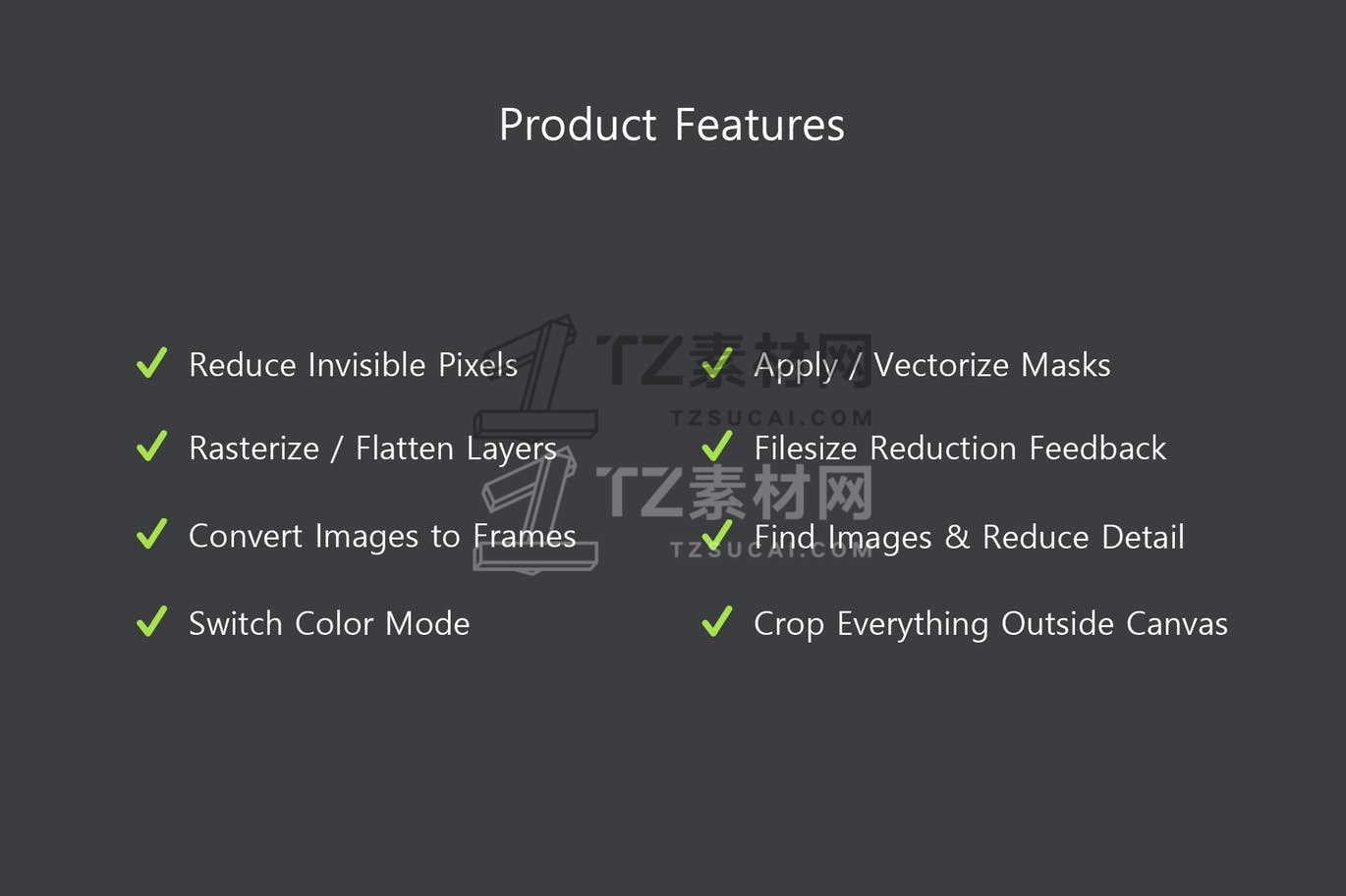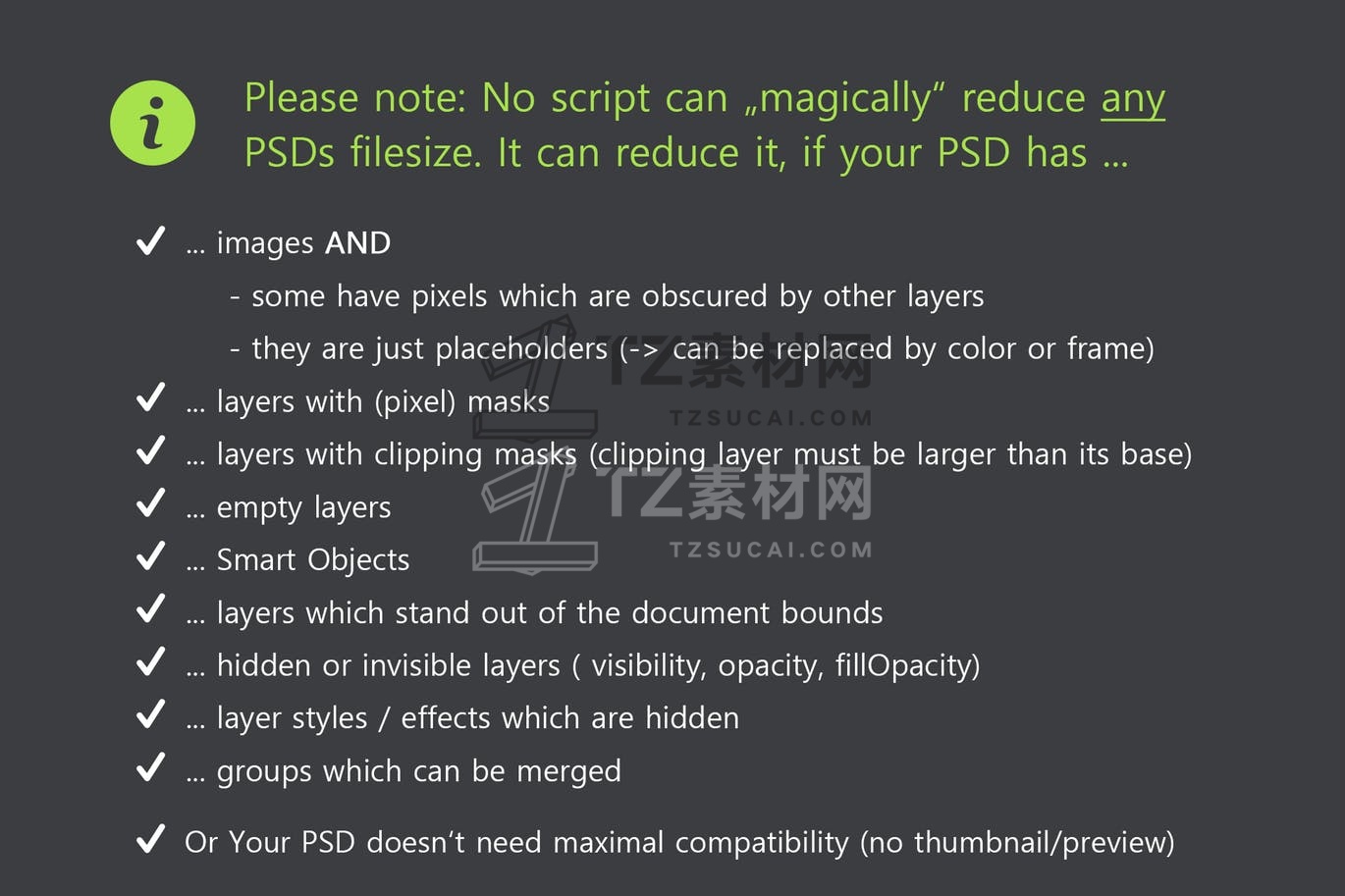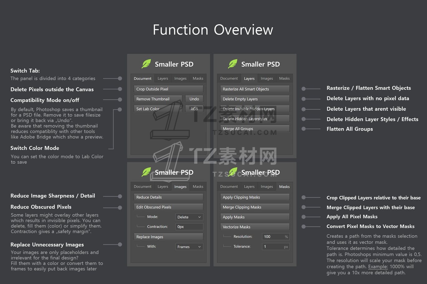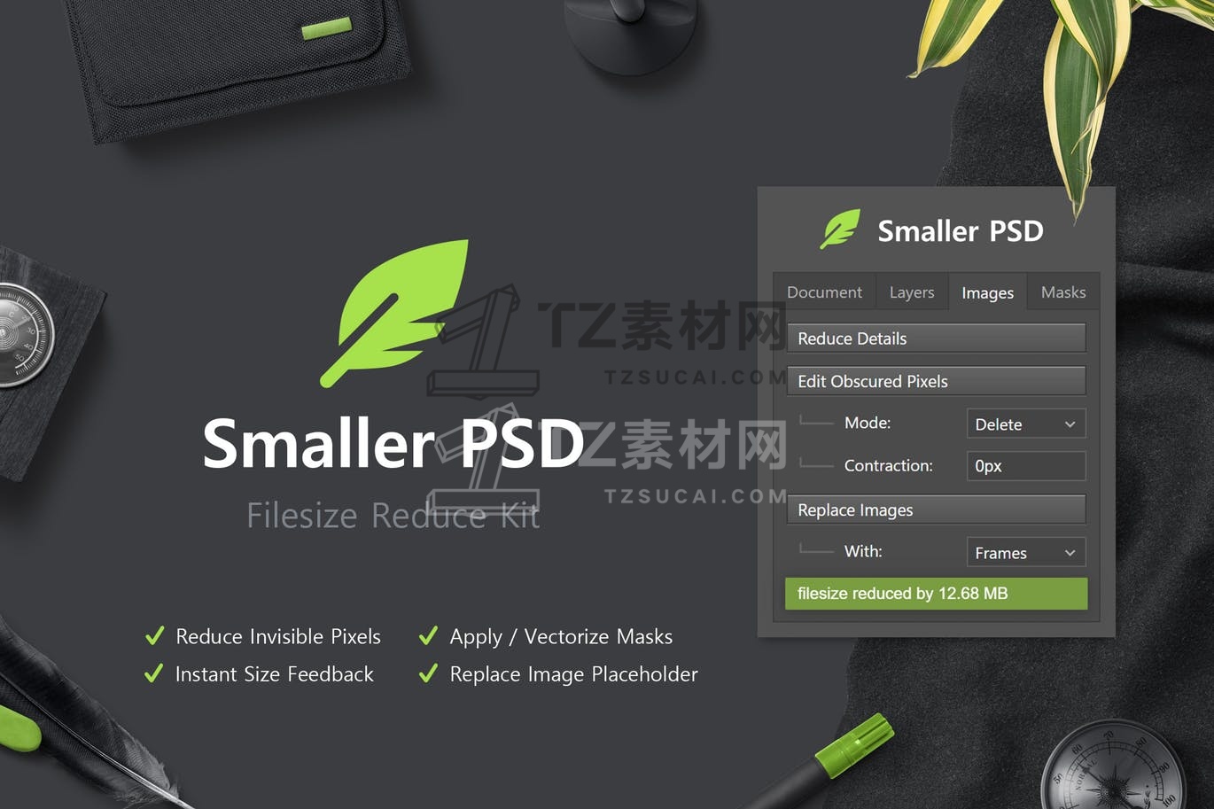 Smaller PSD 提供了各种有用的脚本和函数来减小 PSD 文件大小。它处理所有图层,因此您不必手动选择任何内容。该面板可以减少/删除不可见的图层和像素、拼合或栅格化图层、应用蒙版、用帧替换占位符图像等。