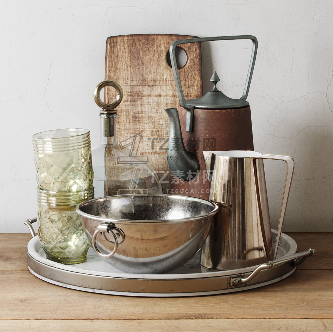 包含两套厨房用具相关3D模型,比如水壶、砧板、杯子、汤勺、铲子等,3DMAX 格式,包含贴图材质