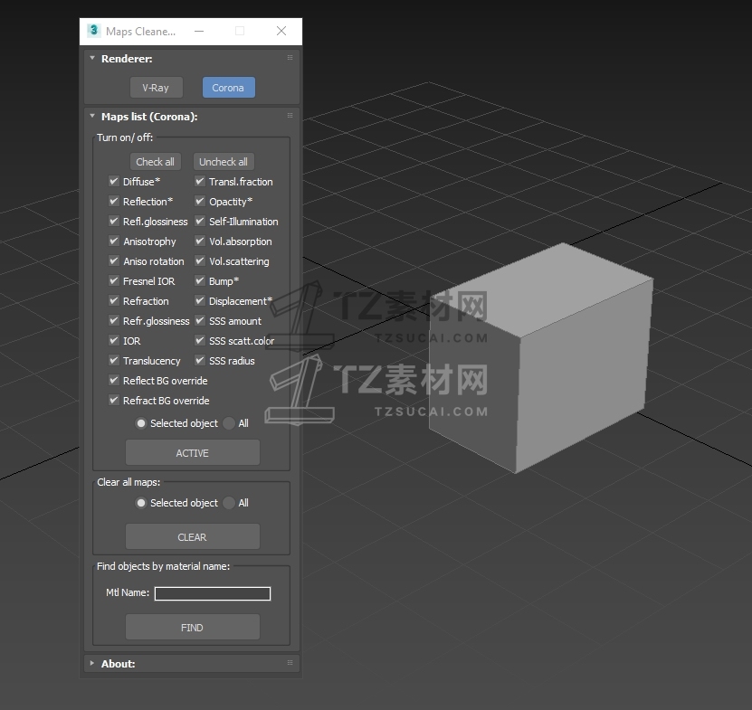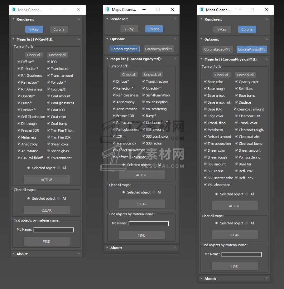 Maps Cleaner是一个脚本,可帮助用户使用V-Ray和Corona渲染器材质有效地管理贴图。它允许用户快速打开/关闭或删除一个或多个选定对象的地图槽。