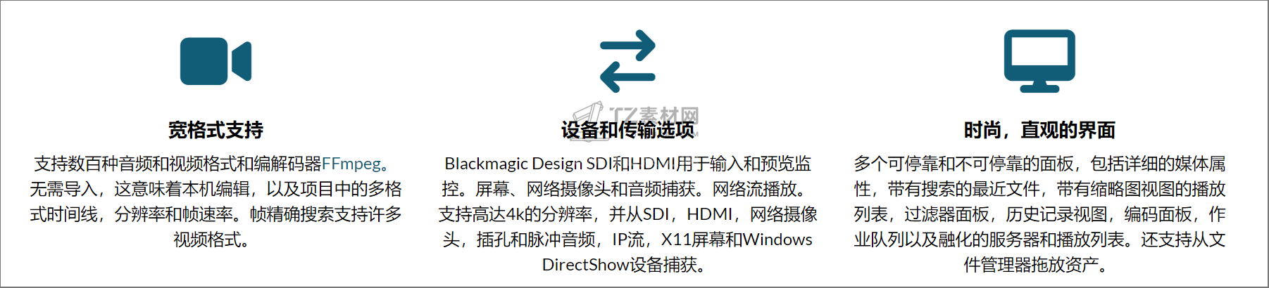 跨视频轨道的视频合成,HTML5(无音频和视频)作为视频源和过滤器,三向(阴影,中音,高光)色轮,用于色彩校正和分级,去隔行,自动旋转