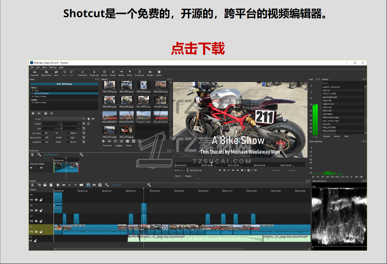Shotcut是一个简易实用,功能全面的开源跨平台的视频剪辑软件,可以对录制的视频进行剪切、添加特效、添加文字、添加滤镜、改变色彩等一系列操作。它也可以作为一个万能视频转换器使用