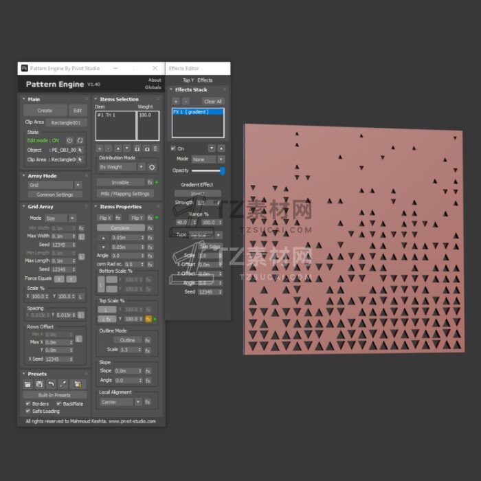 影响: 该工具最强大的功能之一。使用四种效果类型在图案中映射任何符合条件的值:Gradient、Random、Expression 和 Shape。您还可以使用各种混合模式混合效果,以便进行更多控制。