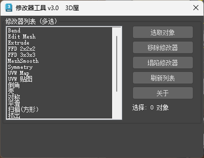 此插件是用于观察场景里有应用了哪些修改器,一些特定的模型用途不能用某些修改器 ,或者某些修改器会导致一些问题。就可以用此插件选择,移除,塌陷修改器来解决问题。