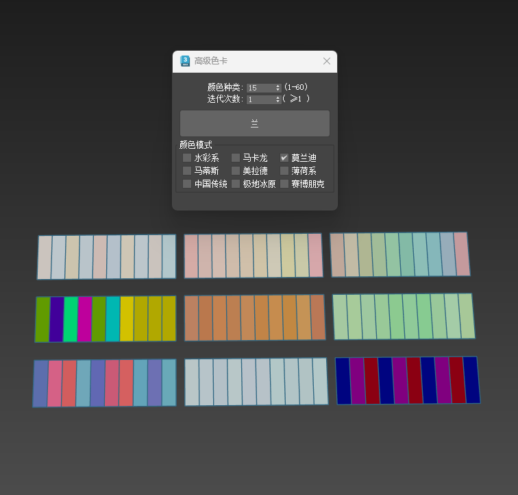 使用方法:解压后直接拖入视口使用;需要创建个模型,选择想要的色系和颜色数量,点击“按钮”就会生成相应的颜色