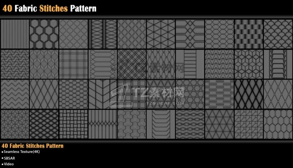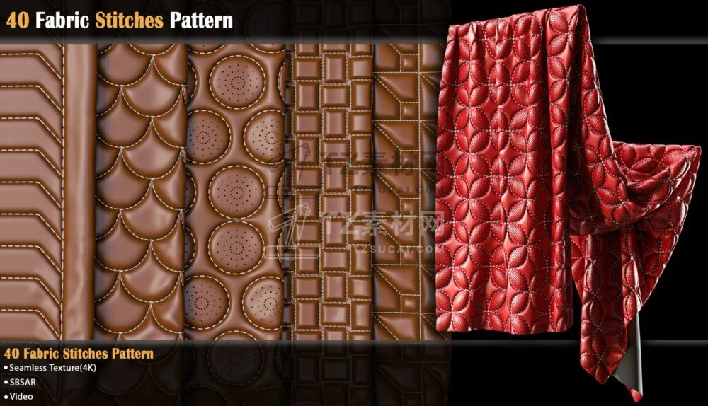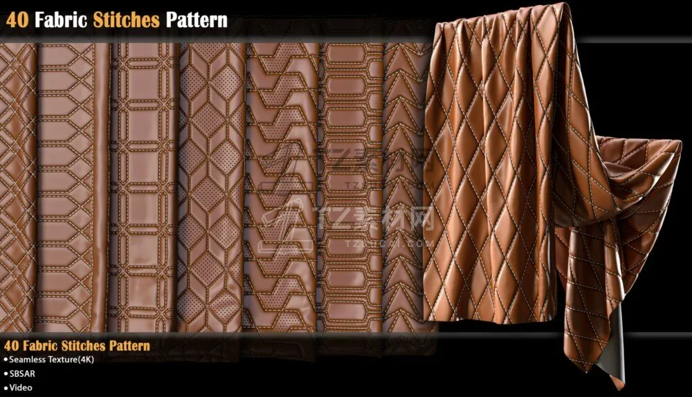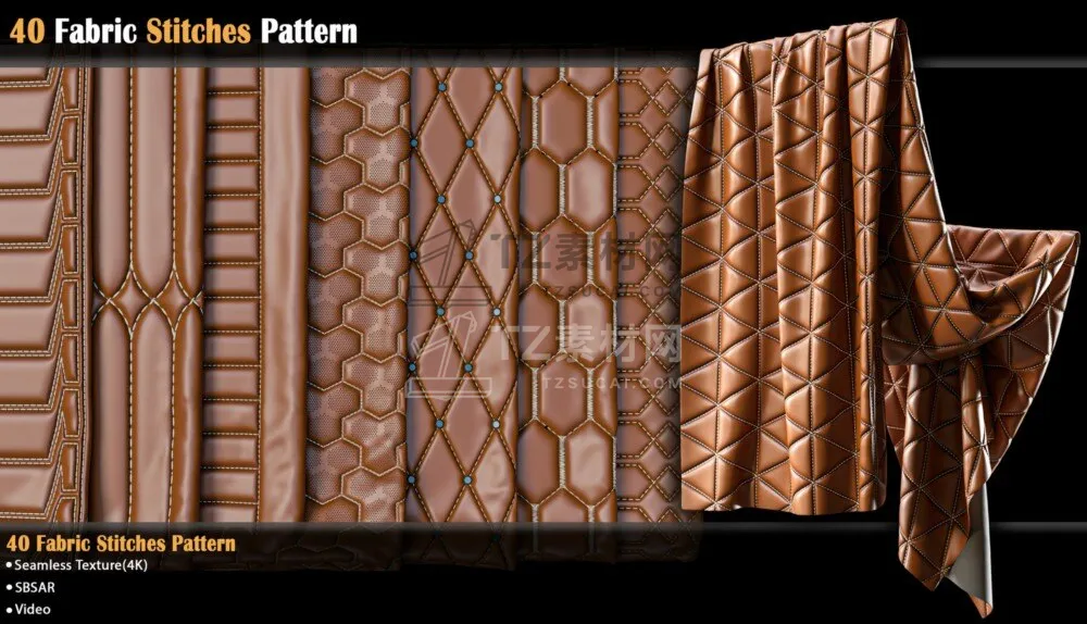 包含40组皮革缝线图案材质预设,可以应用于包袋、椅子、汽车座椅、床铺以及一些服装项目中,sbsar格式+PNG格式贴图,可以更改图案颜色、针脚颜色以及图案蓬松度