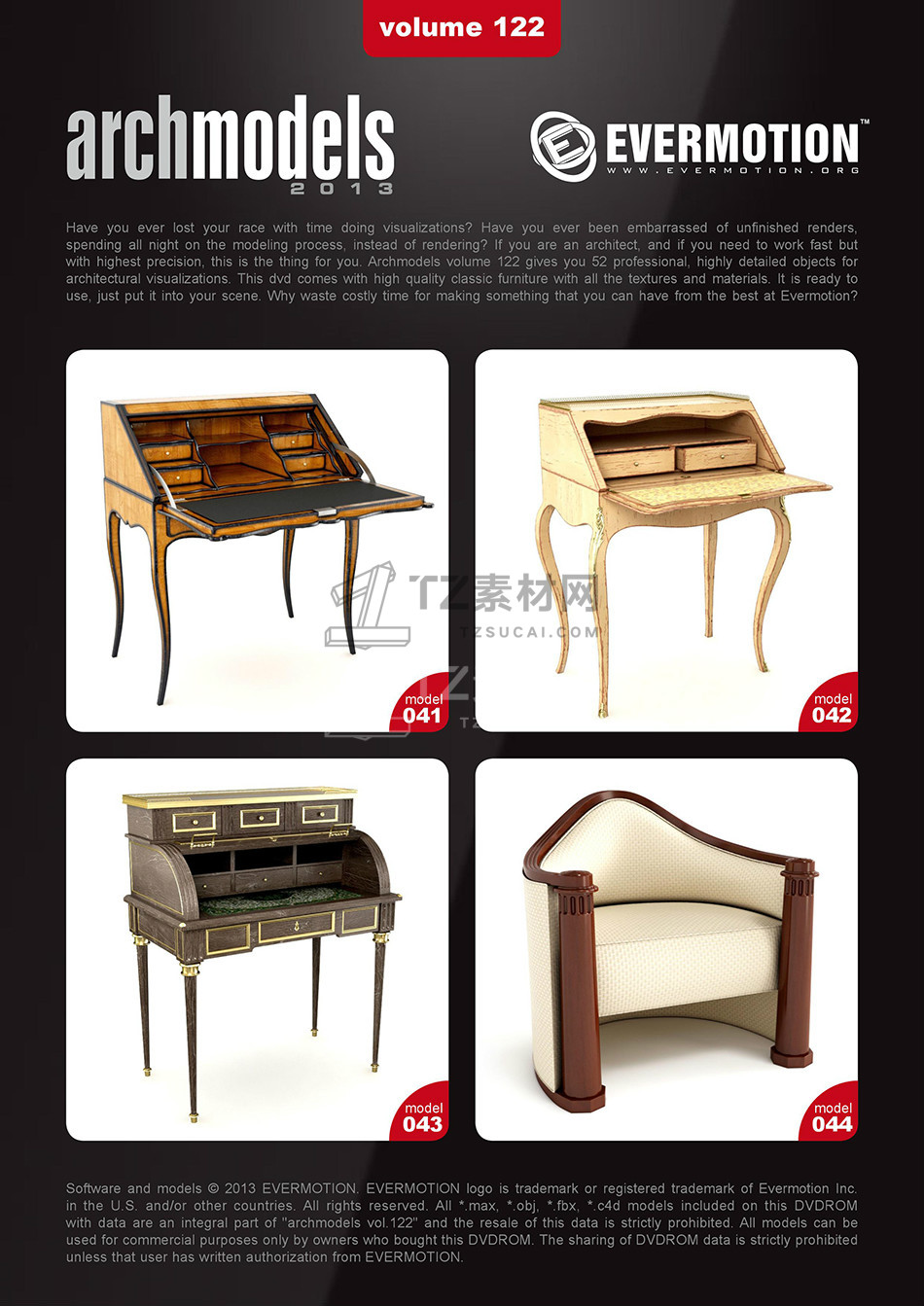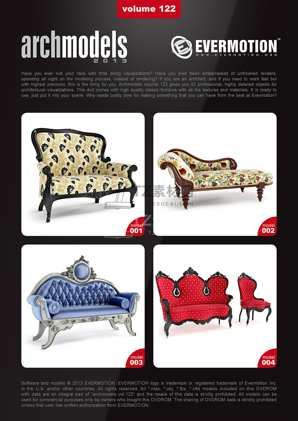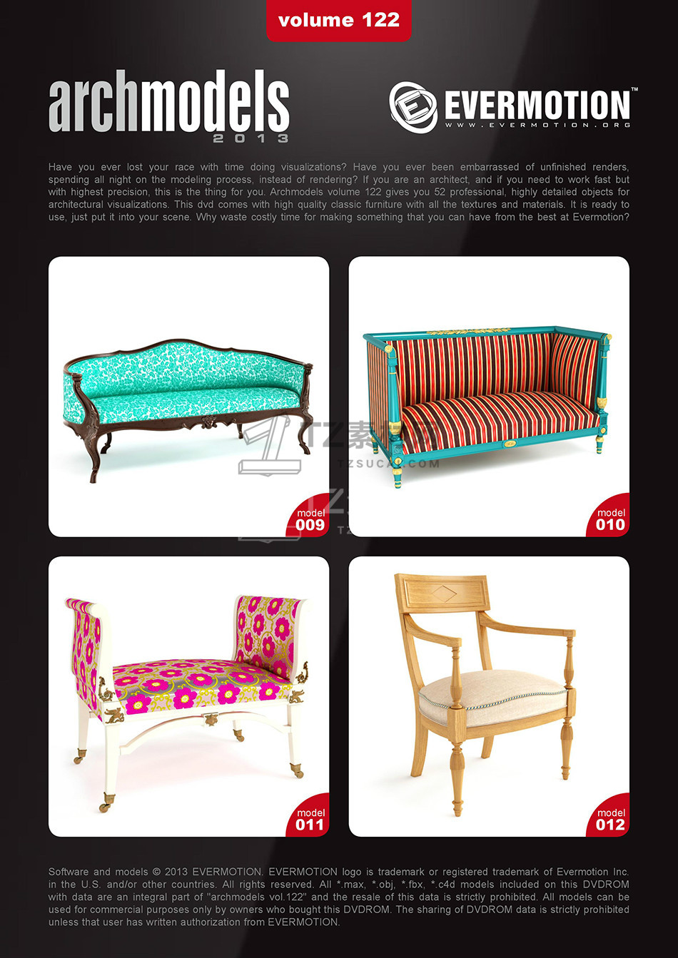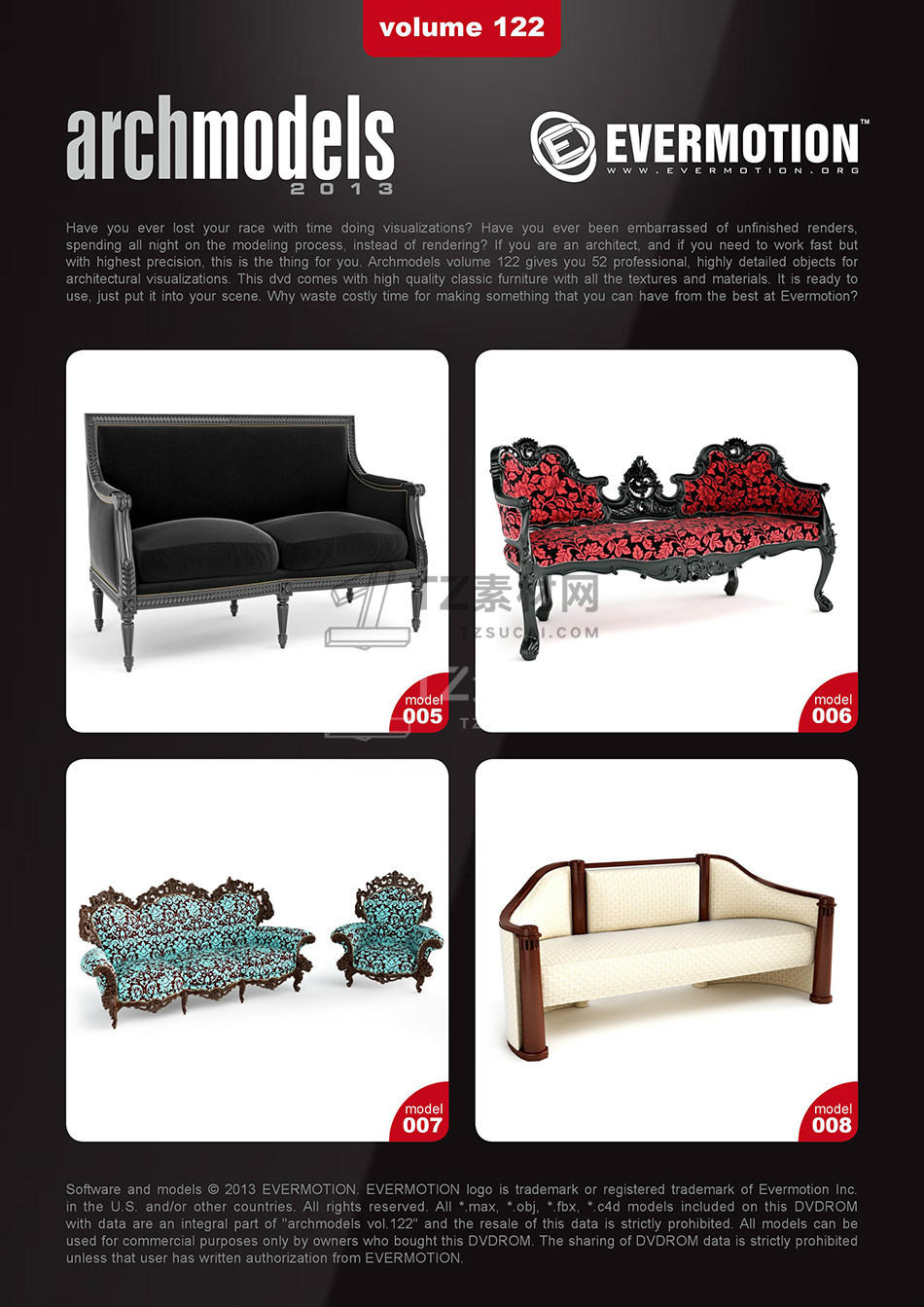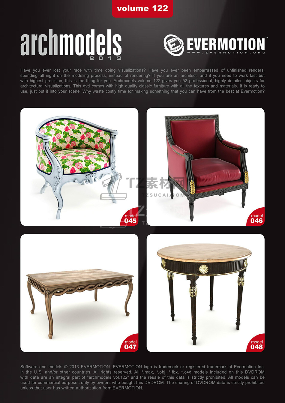 rchmodels vol. 122包含52个高精度西方欧式古典家具模型,模型都包含贴图材质,3DS MAX格式,Vray渲染器