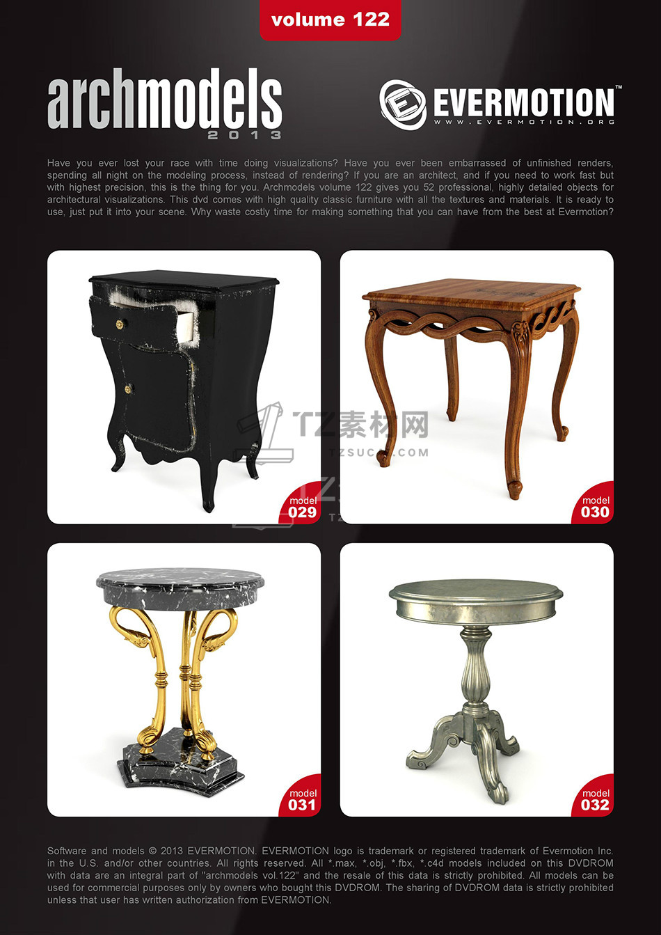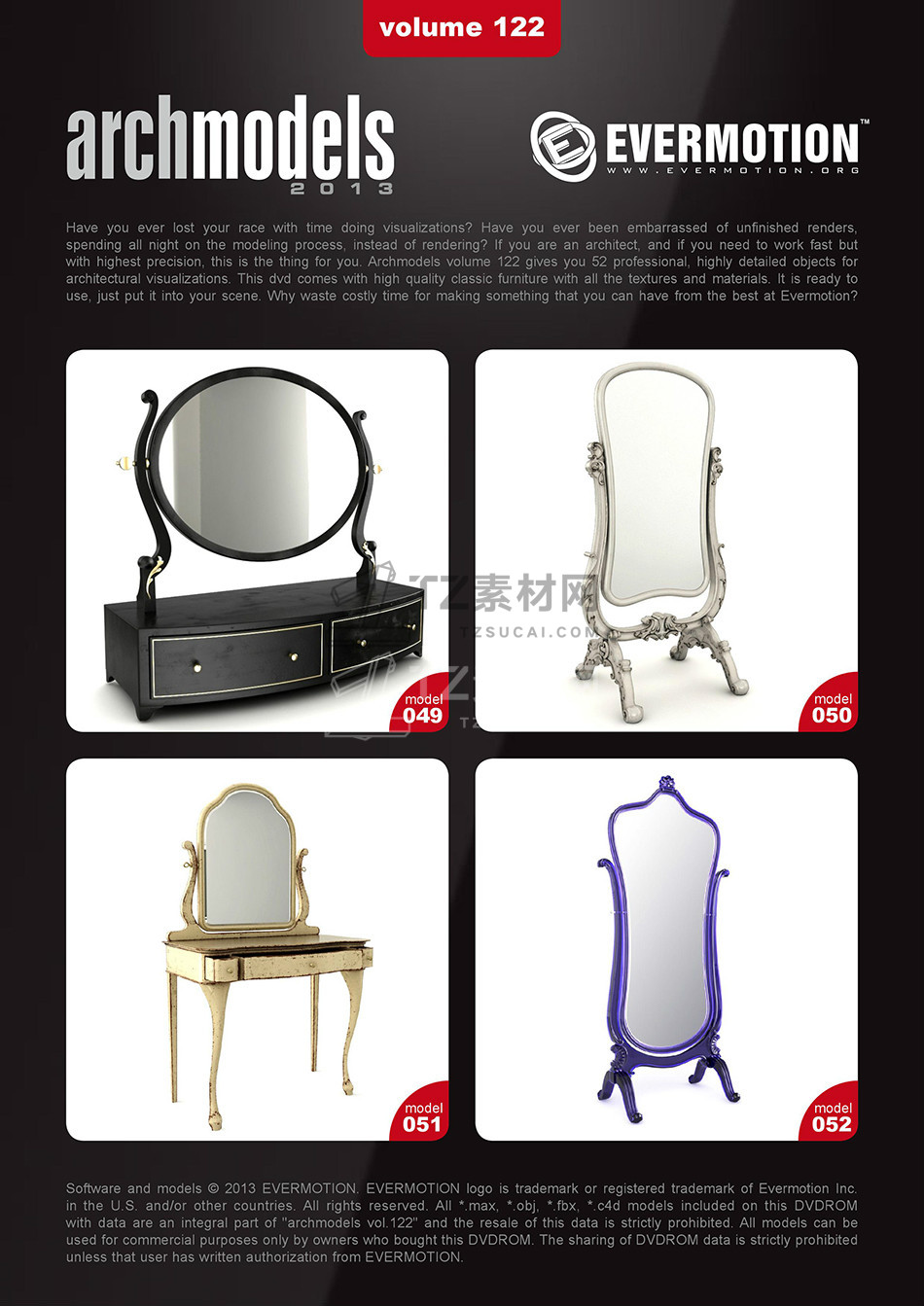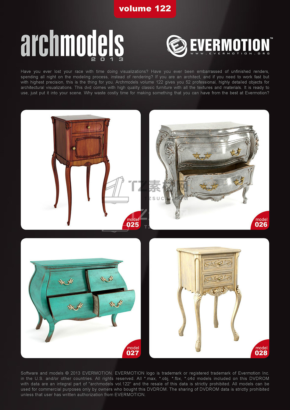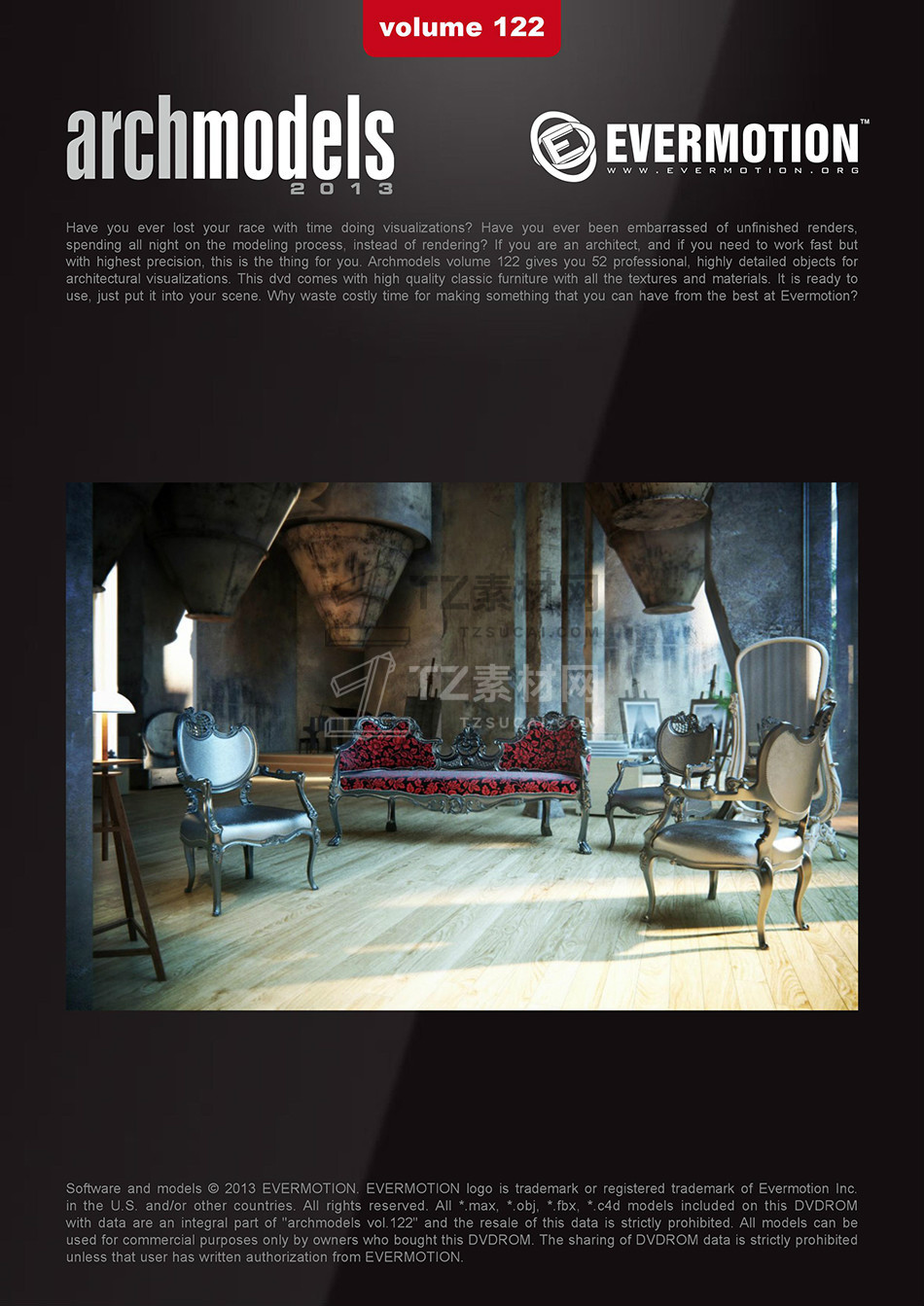 rchmodels vol. 122包含52个高精度西方欧式古典家具模型,模型都包含贴图材质,3DS MAX格式,Vray渲染器
