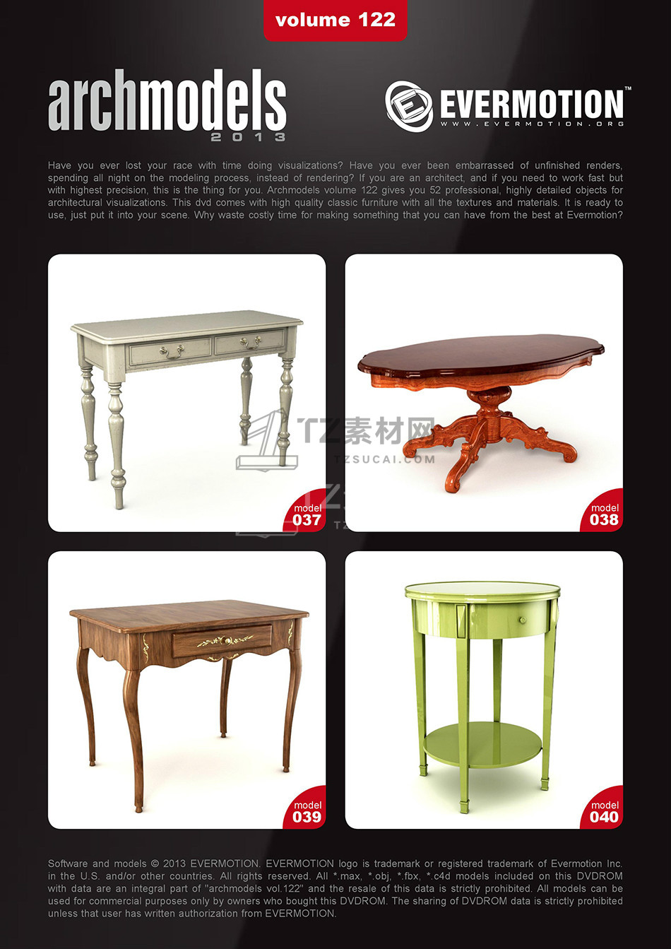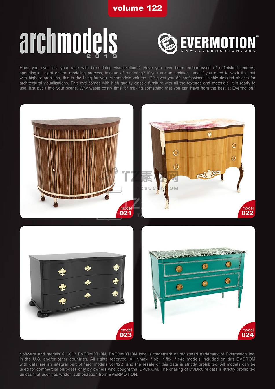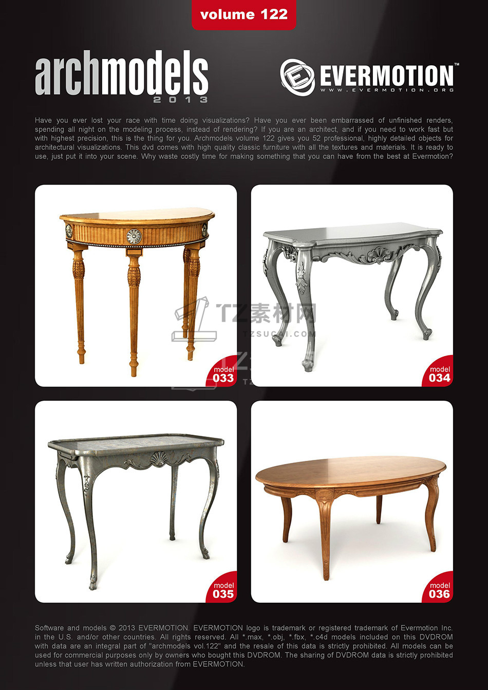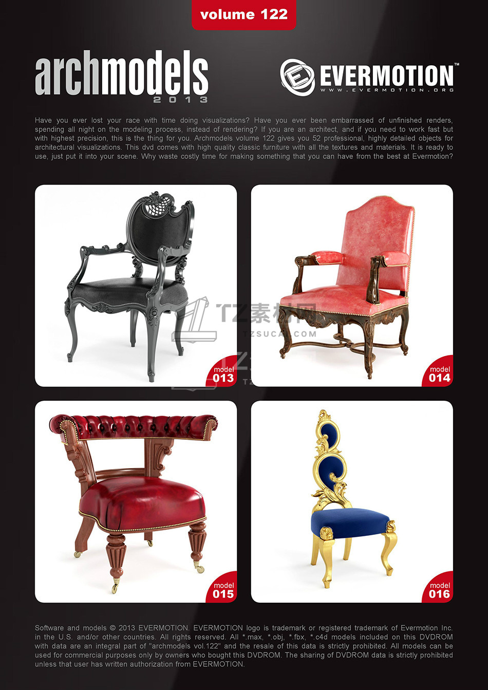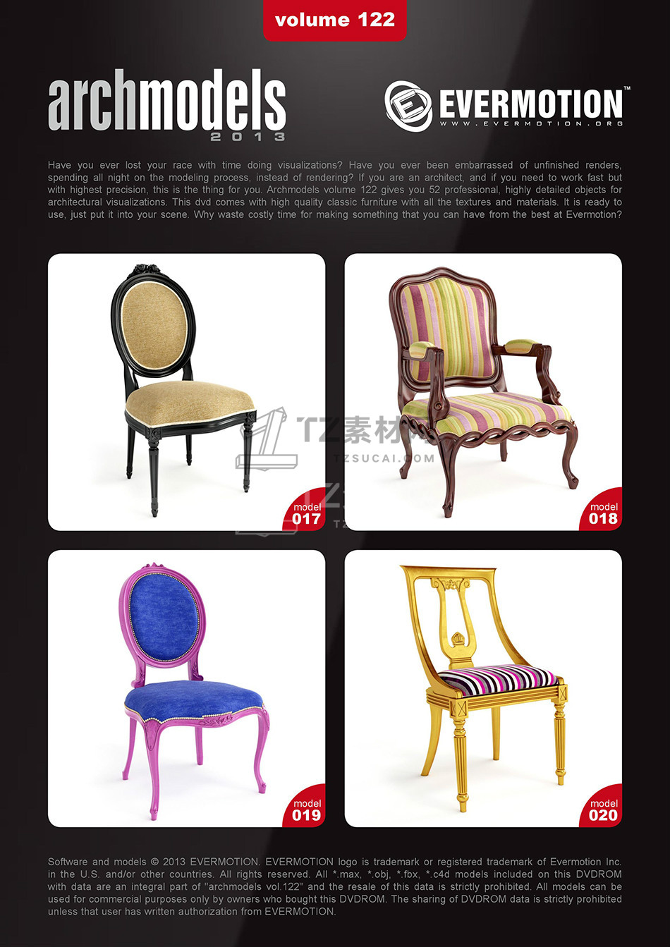 rchmodels vol. 122包含52个高精度西方欧式古典家具模型,模型都包含贴图材质,3DS MAX格式,Vray渲染器