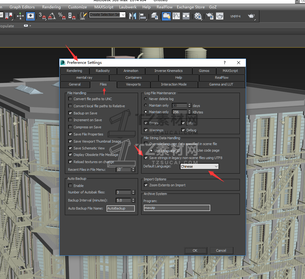 因为软件都是老外写的,脚本也是老外写的,这个脚本在调用修改器的时候都是英文命令,所以使用此脚本的时候要使用英文3DMAX(可以用VR中英文切换器启动英文版MAX),启动英文版MAX后M按照截图max的首选项设置 "savr strings in legacy non-scene files using UTF8"勾选上,DefaultLanguage 设置成 Chinese ,否则中文插件在英文MAX显示乱码