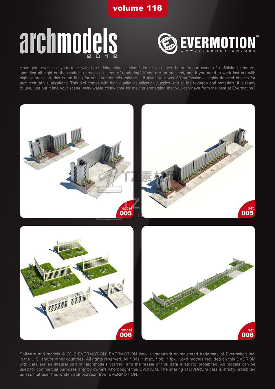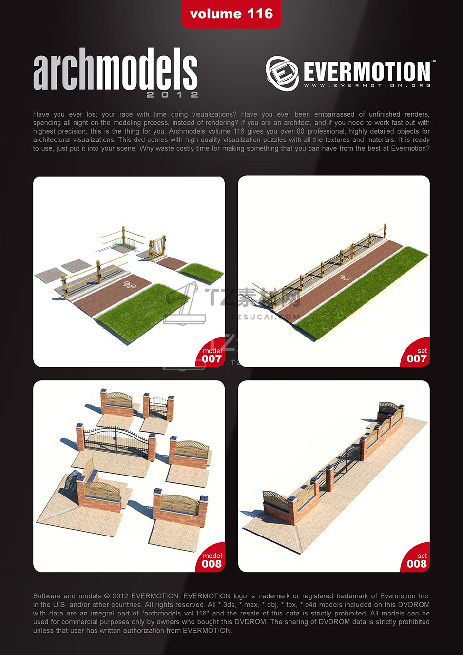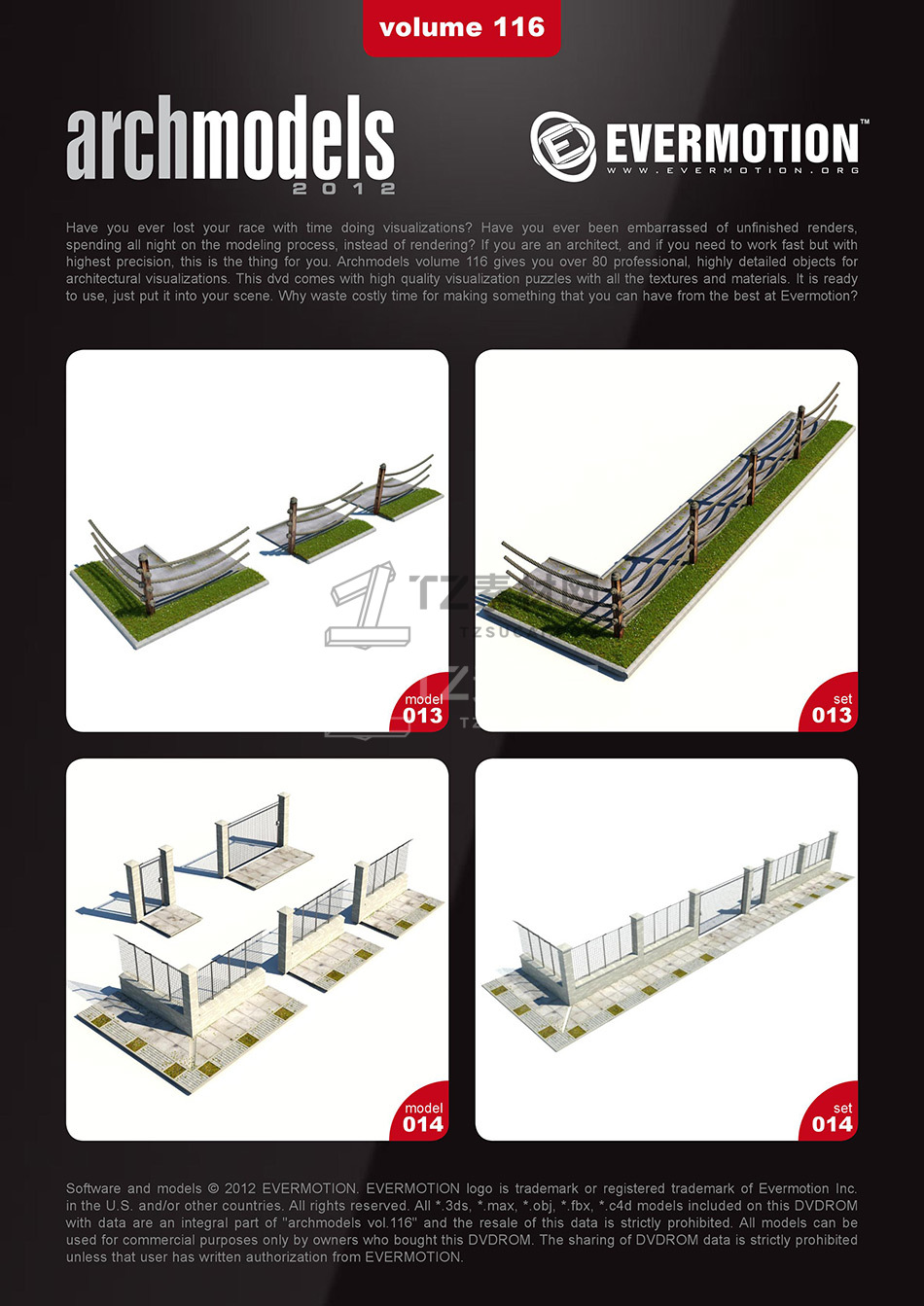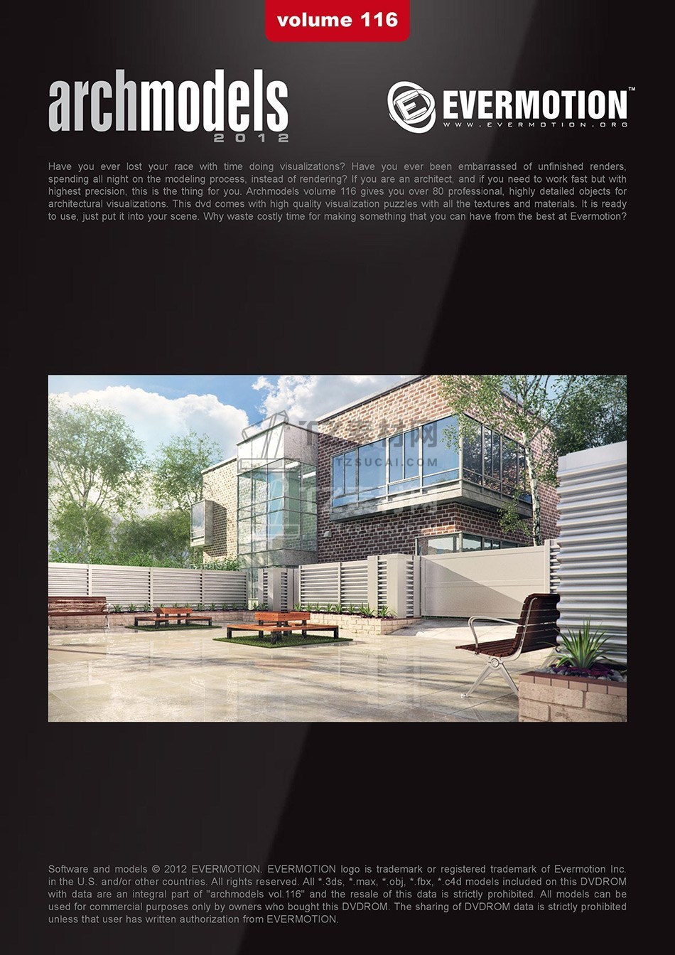 Archmodels vol. 116包含26个围栏模型和25个草坪,篱笆,长椅,大门,人行道等模型,包含贴图材质,3DS MAX格式,Vray渲染器