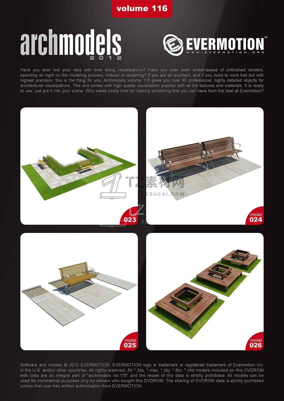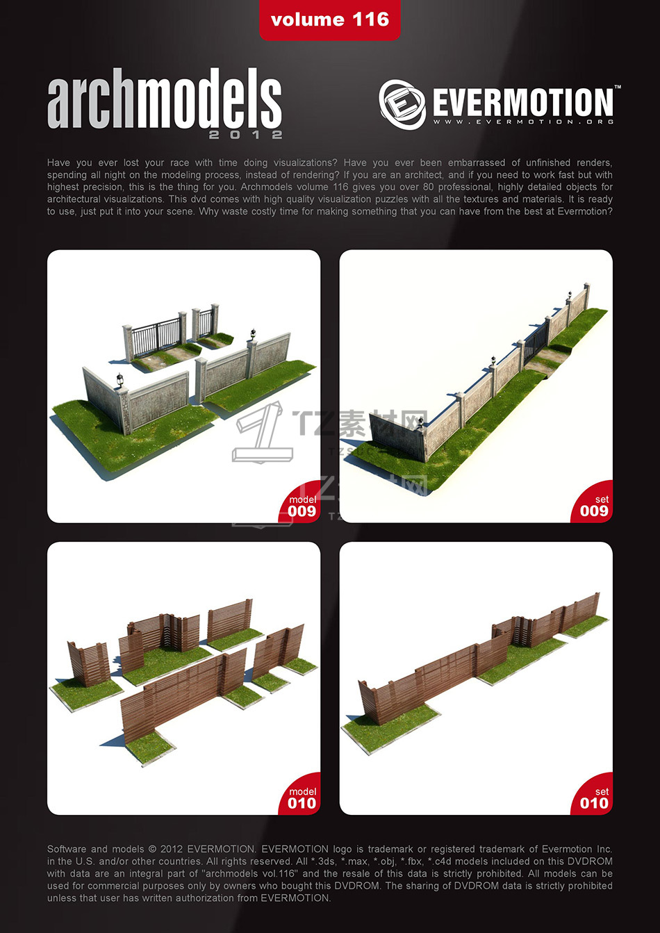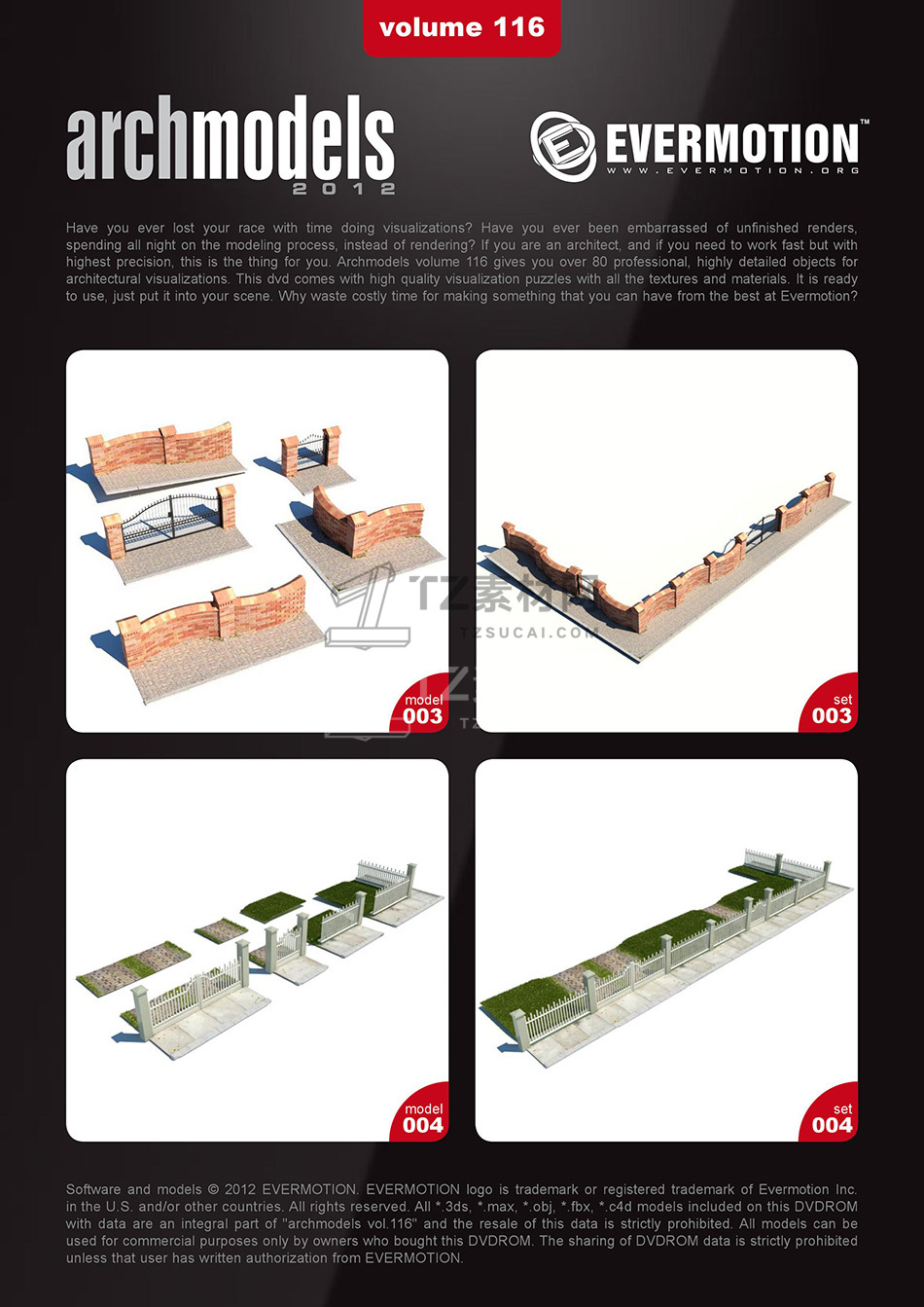 Archmodels vol. 116包含26个围栏模型和25个草坪,篱笆,长椅,大门,人行道等模型,包含贴图材质,3DS MAX格式,Vray渲染器