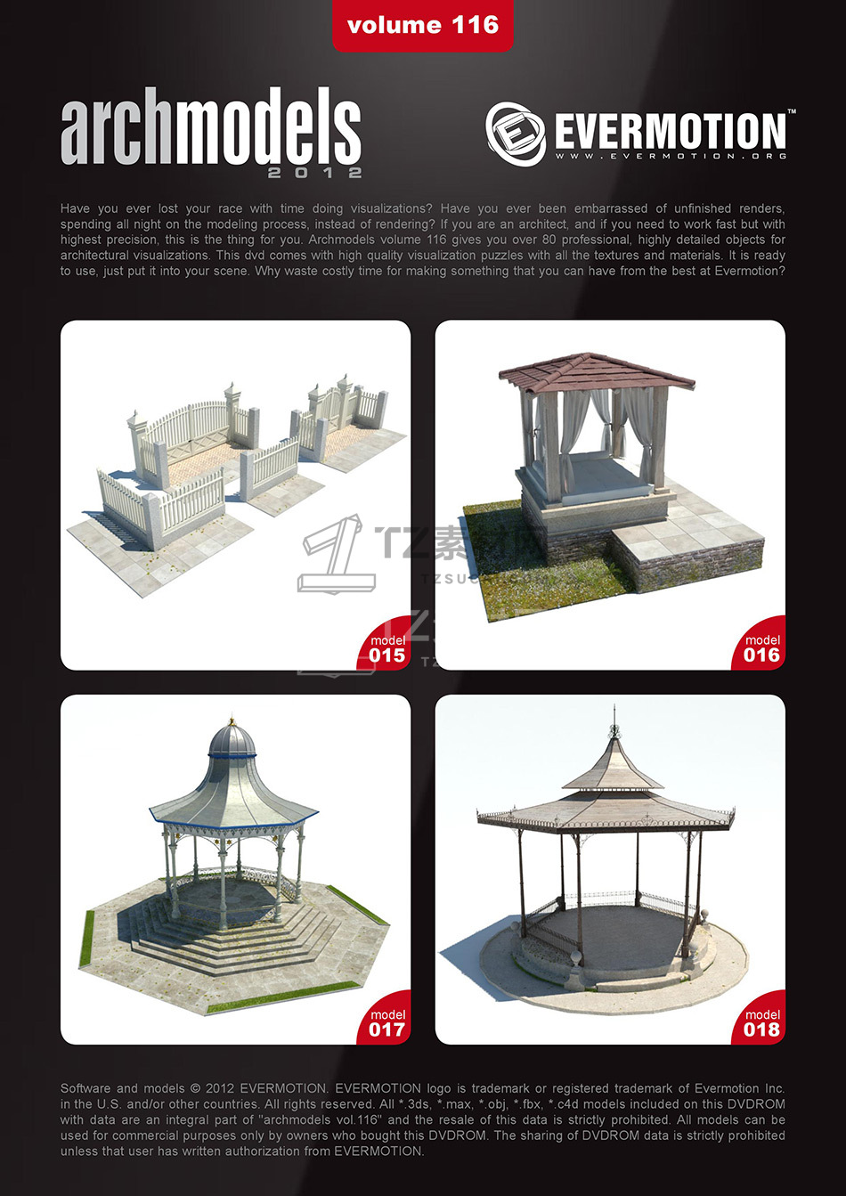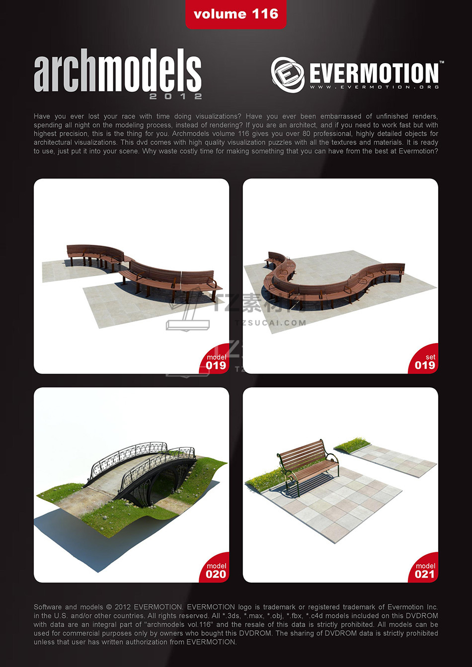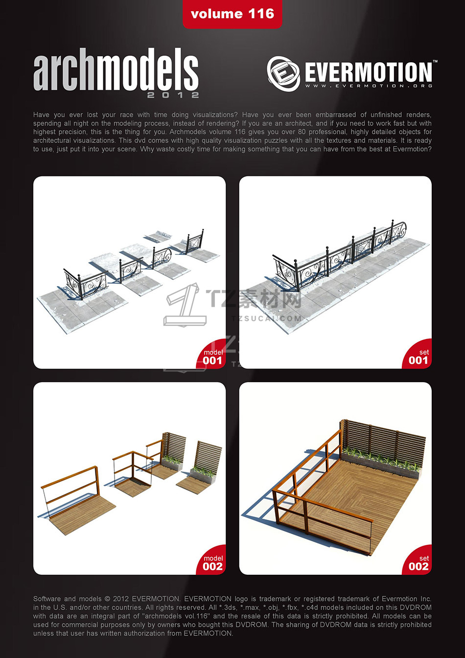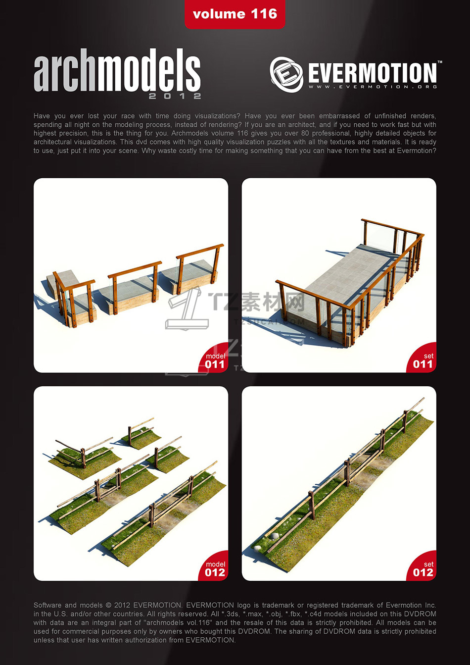 Archmodels vol. 116包含26个围栏模型和25个草坪,篱笆,长椅,大门,人行道等模型,包含贴图材质,3DS MAX格式,Vray渲染器