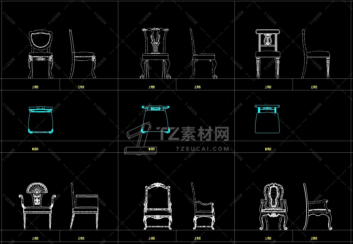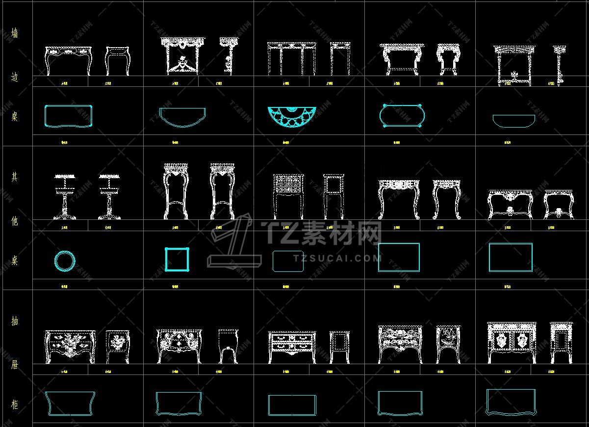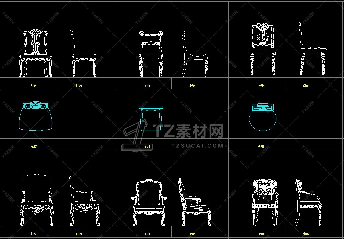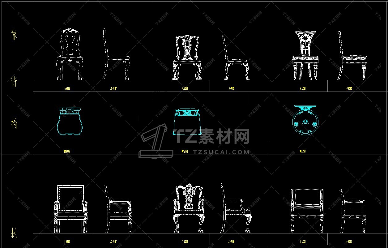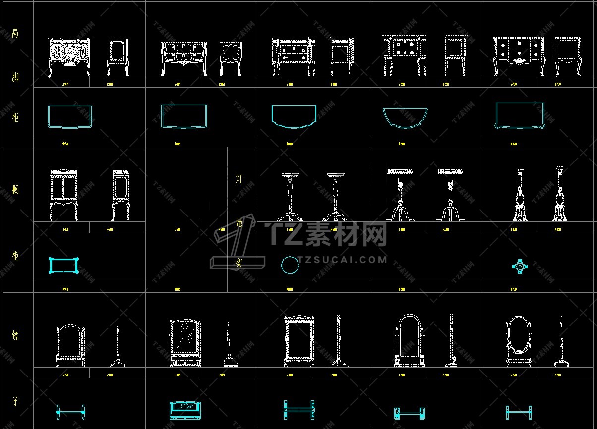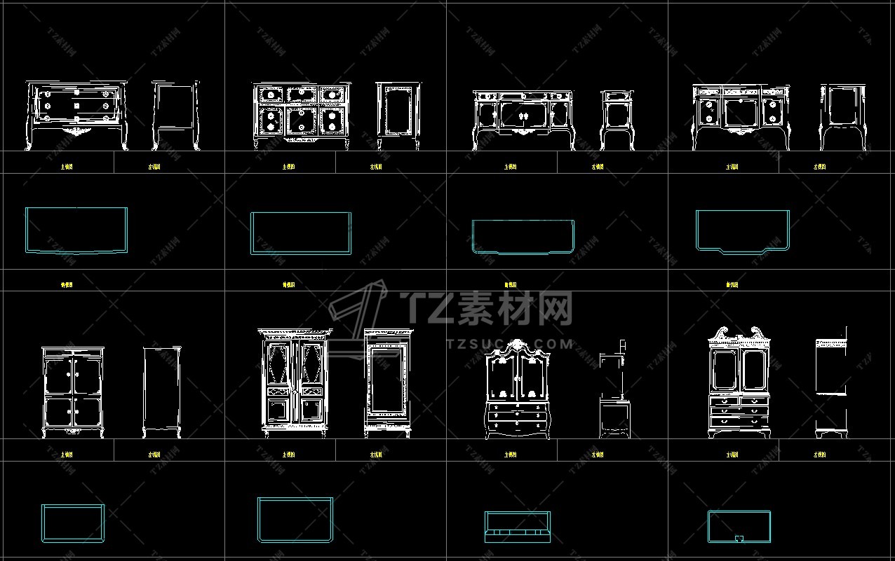 本套欧式风格的CAD平立图库包含:靠背椅、扶手椅、 长椅、长躺椅、凳子、圆桌、长餐桌、沙发椅、长沙发、四柱床、沙发床、酒桌、餐桌、备膳台、餐具桌、三角桌、书桌、写字台、梳妆台、墙边桌、游戏桌、边柜、书柜、箱柜、抽屉柜、墙角柜、脸盆架、衣柜、高脚柜、橱柜、灯烛架、书架、乐普架、餐点架、菜架、花盆架、神坛、壁炉、屏风、镜子、杂件、锁孔、拉手、雕花纹样、线条、脚样等等!