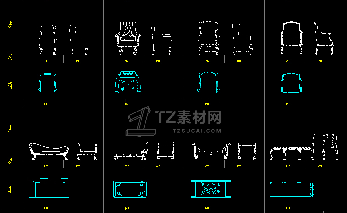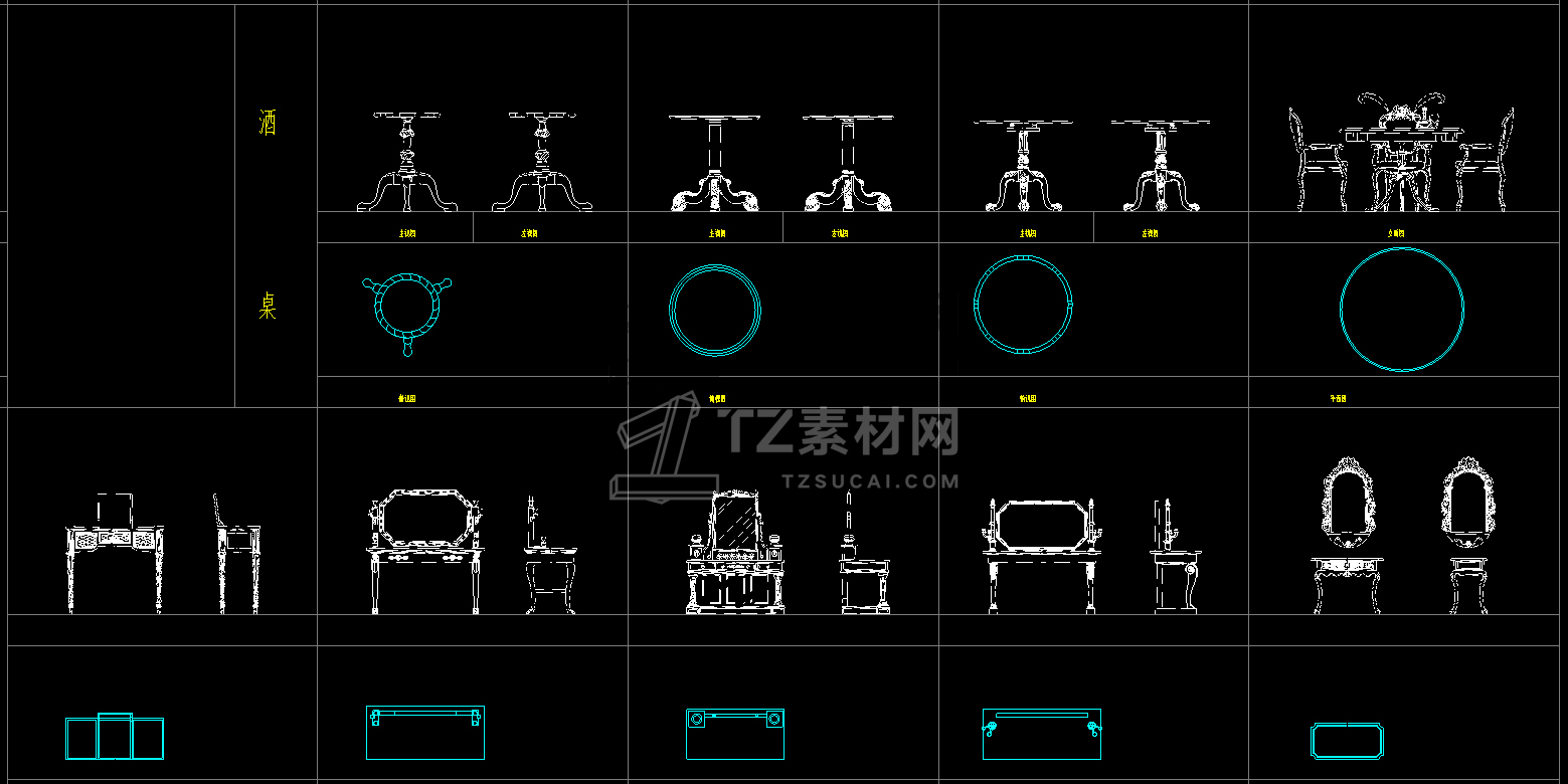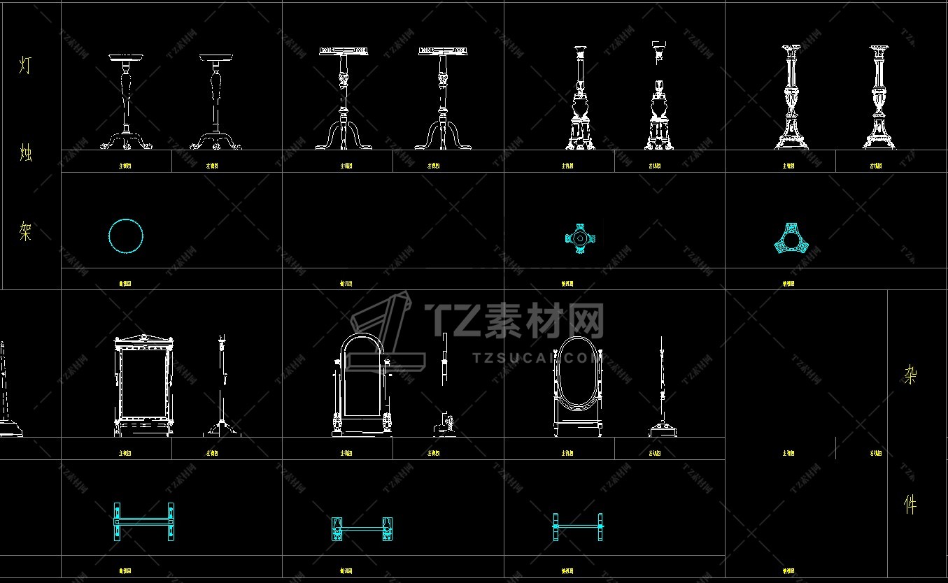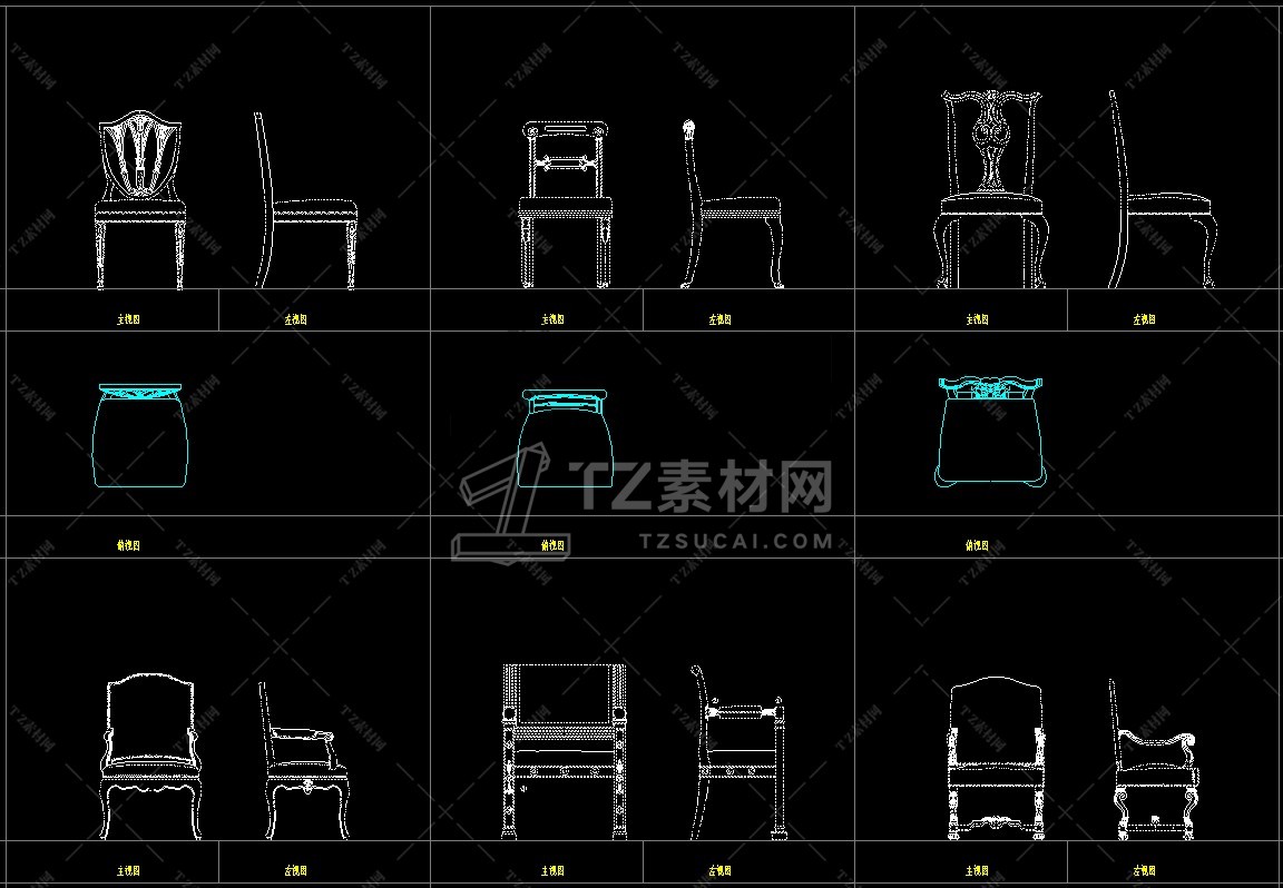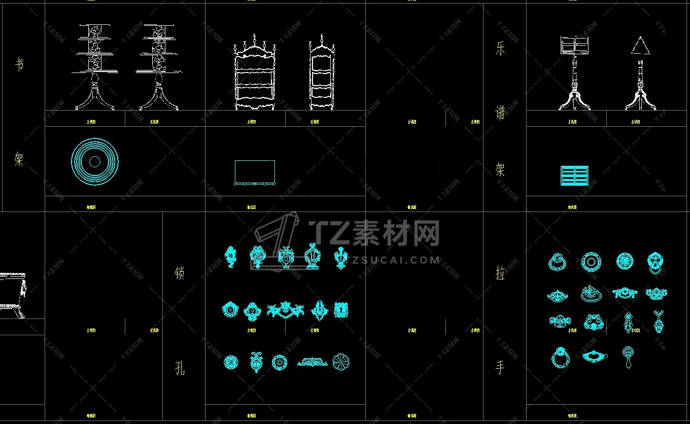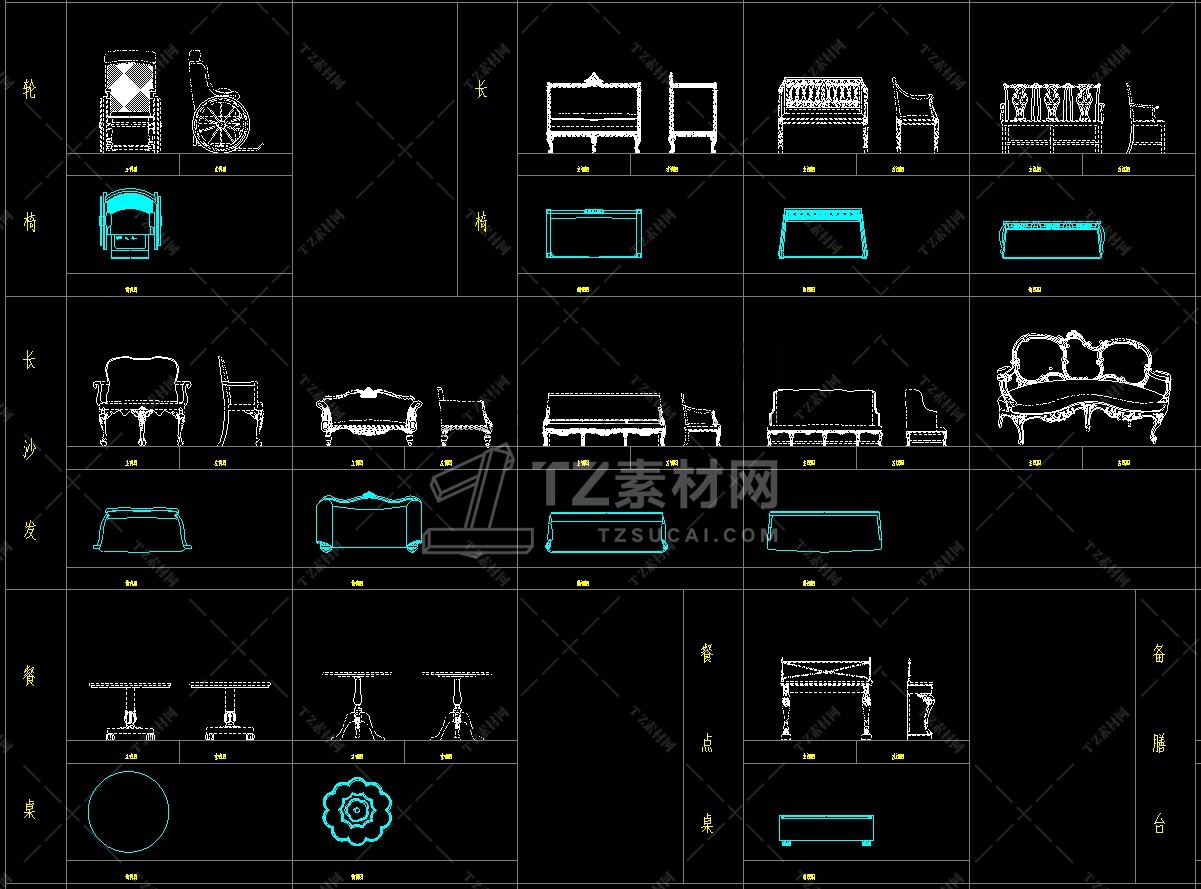 本套欧式风格的CAD平立图库包含:靠背椅、扶手椅、 长椅、长躺椅、凳子、圆桌、长餐桌、沙发椅、长沙发、四柱床、沙发床、酒桌、餐桌、备膳台、餐具桌、三角桌、书桌、写字台、梳妆台、墙边桌、游戏桌、边柜、书柜、箱柜、抽屉柜、墙角柜、脸盆架、衣柜、高脚柜、橱柜、灯烛架、书架、乐普架、餐点架、菜架、花盆架、神坛、壁炉、屏风、镜子、杂件、锁孔、拉手、雕花纹样、线条、脚样等等!