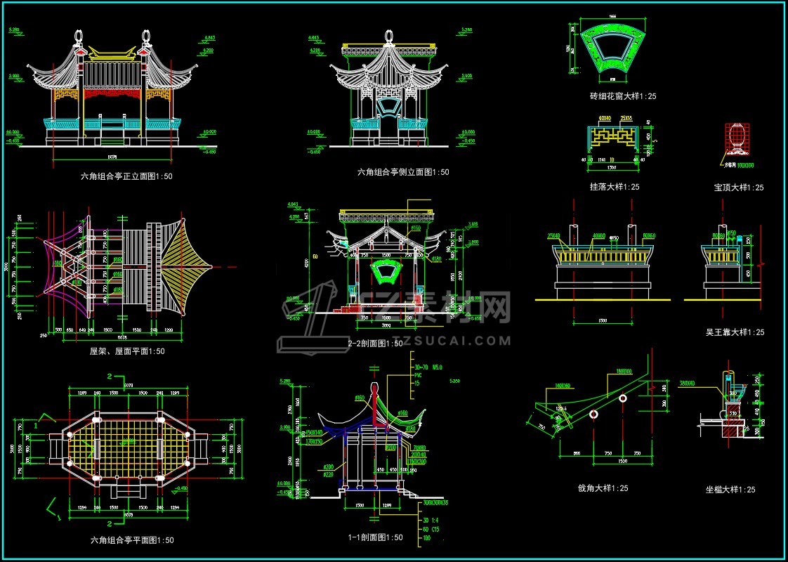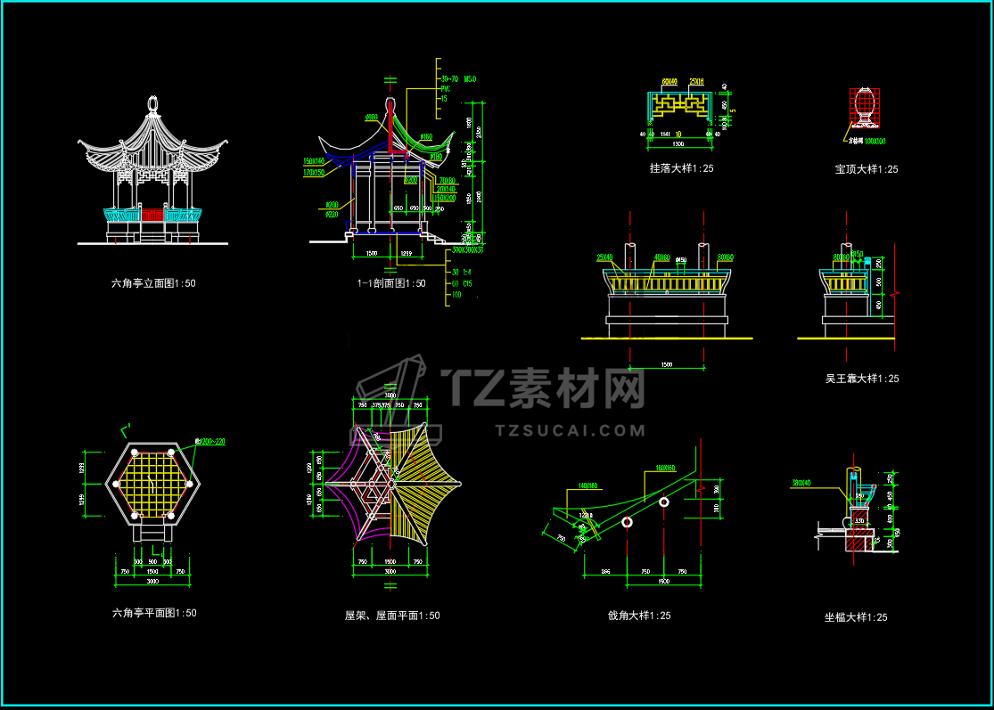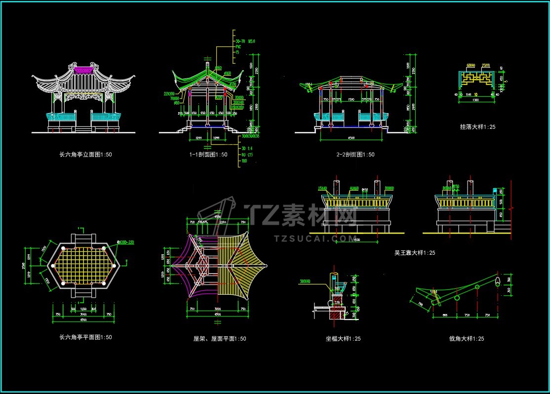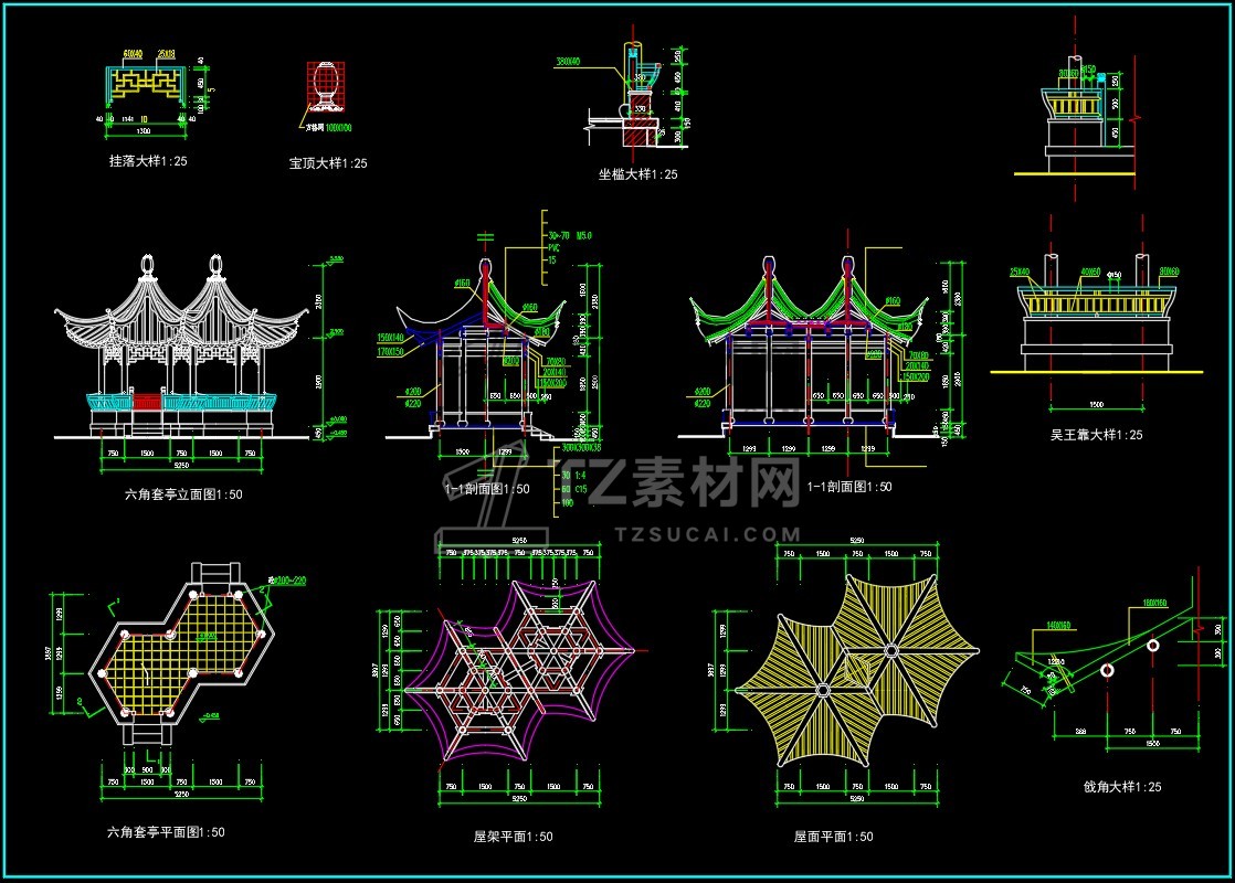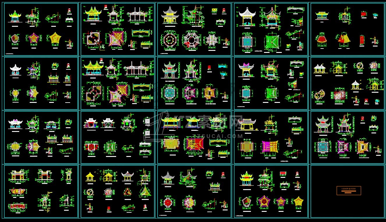 CAD亭子大全六角亭施工图CAD图库图块