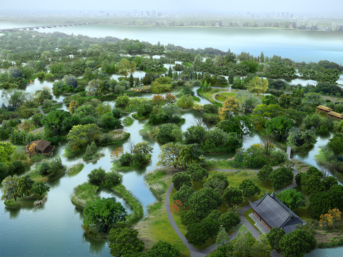 公园鸟瞰图湿地滨水园林景观psd素材下载