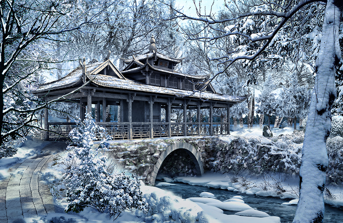 公园桥廊雪景景观后期psd素材源文件分层图层