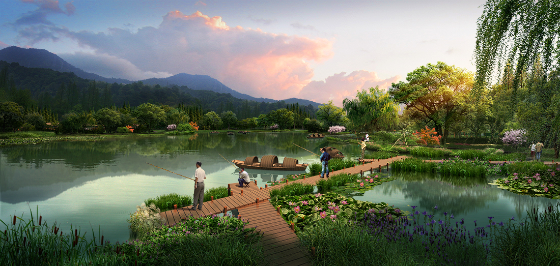 公园木栈道湖泊钓鱼人后期psd素材源文件分层图层