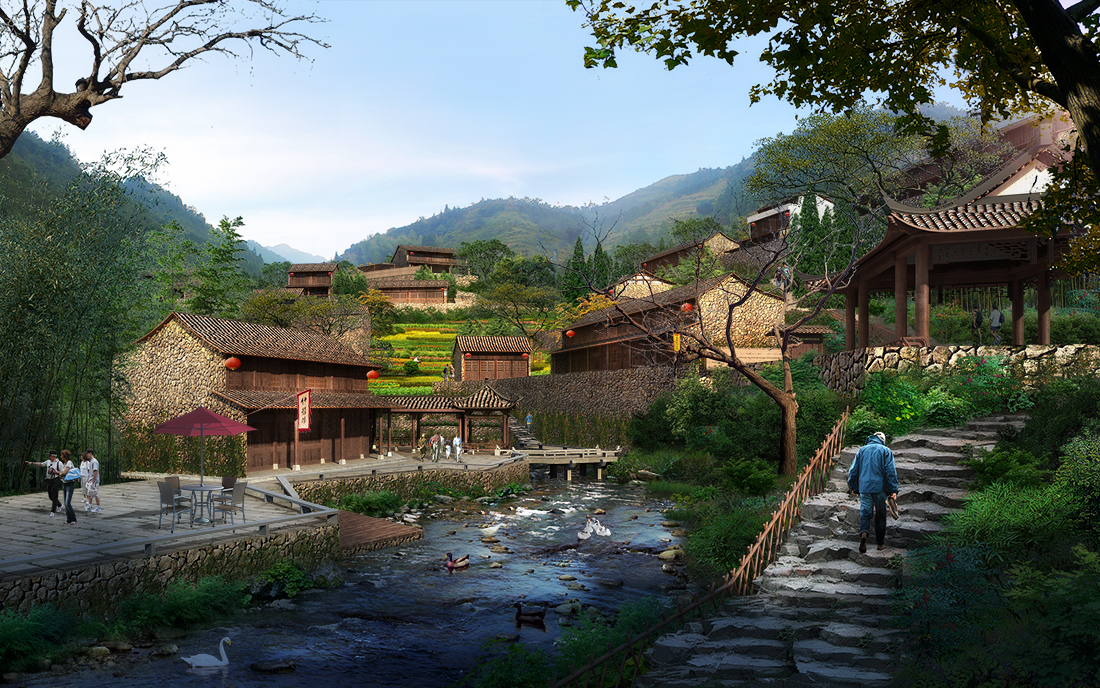 乡村古风河流房屋森林景观后期psd素材源文件分层图层