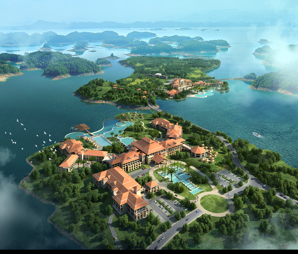 酒店度假村湖泊岛屿鸟瞰图后期psd素材源文件分层图层