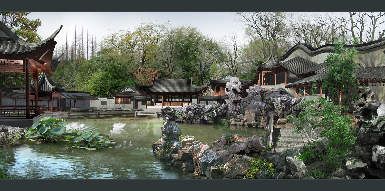 中式庭院荷塘假山古典建筑庭院后期psd素材源文件分层图层