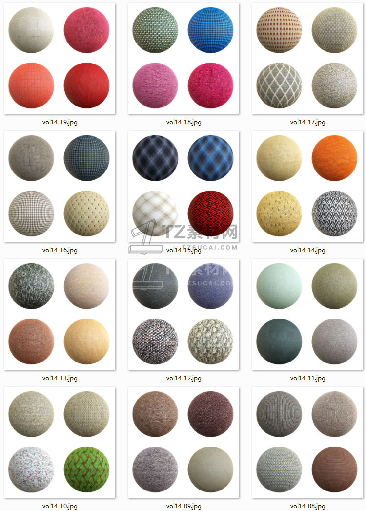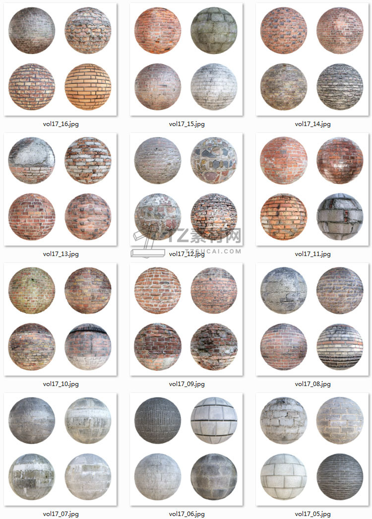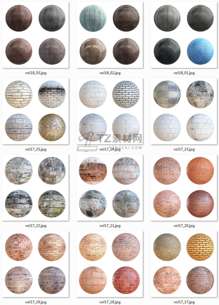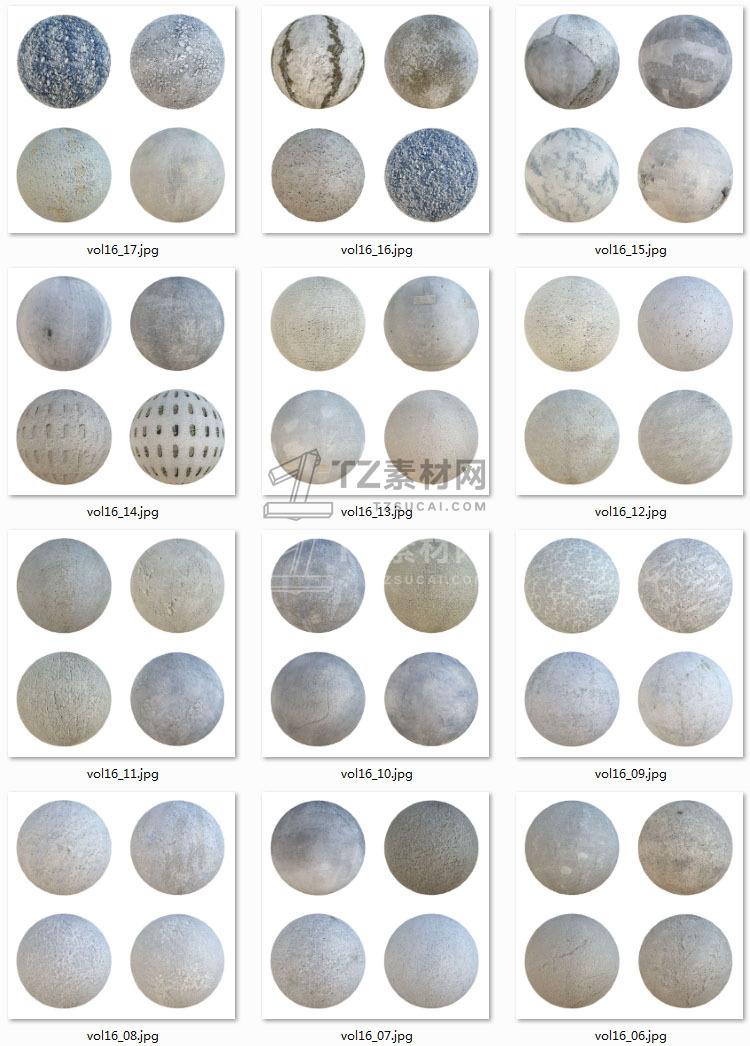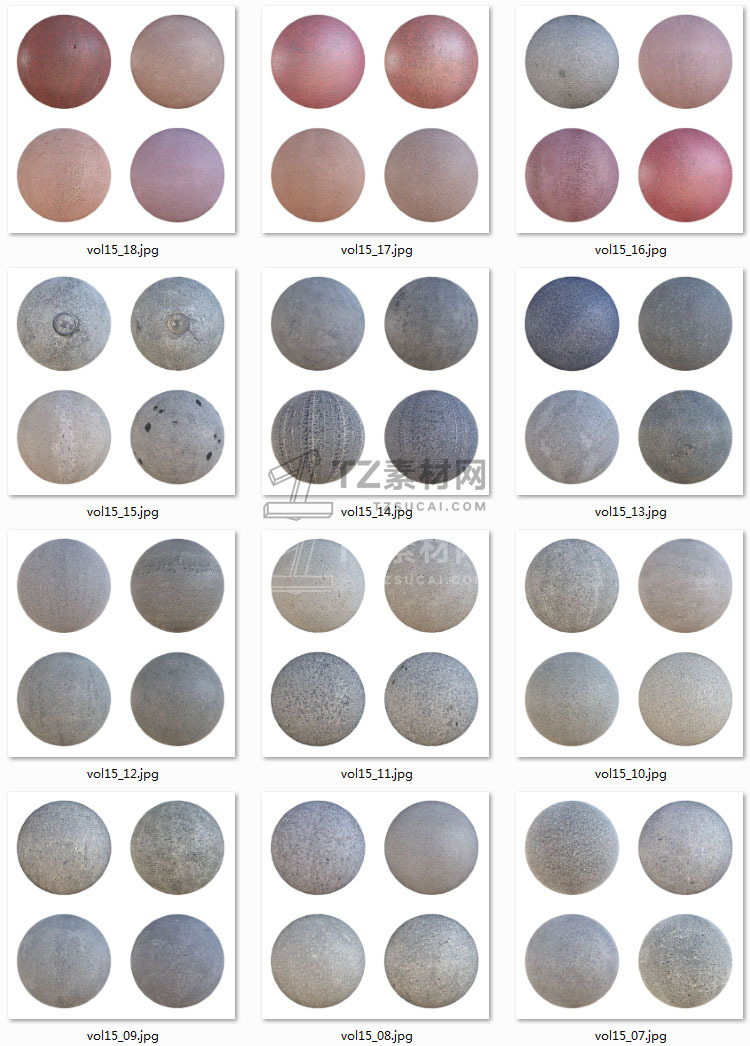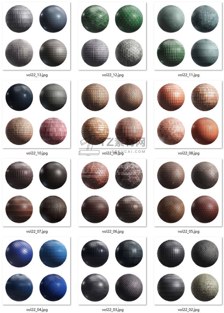vol.01-vol.17每套贴图有5个贴图,【diffuse漫反射贴图】,【glossiness光泽度贴图】,【height高度贴图】,【normal法线贴图】,【reflection折射贴图】