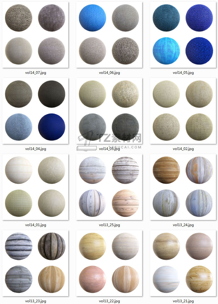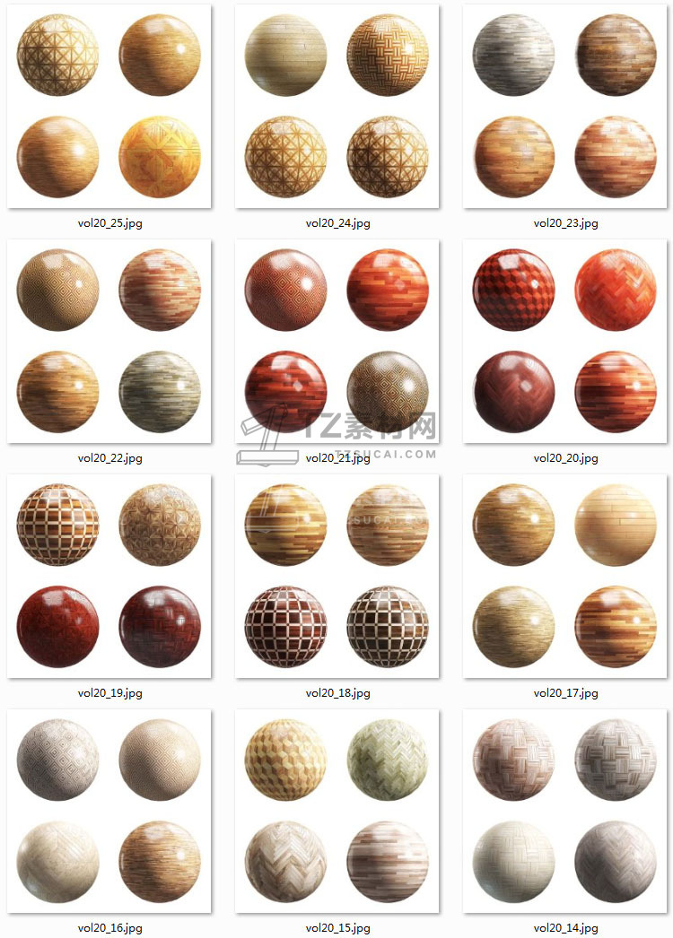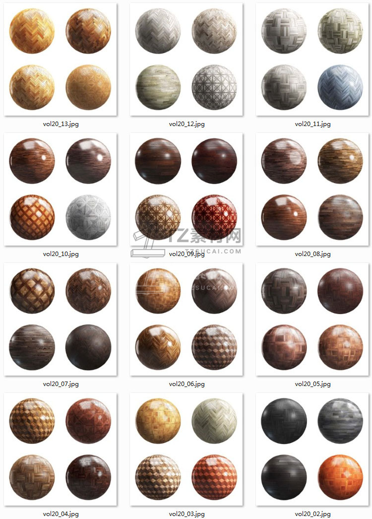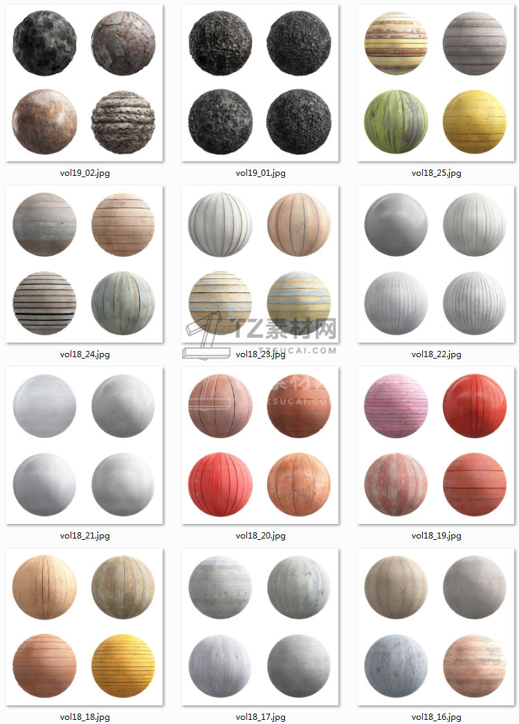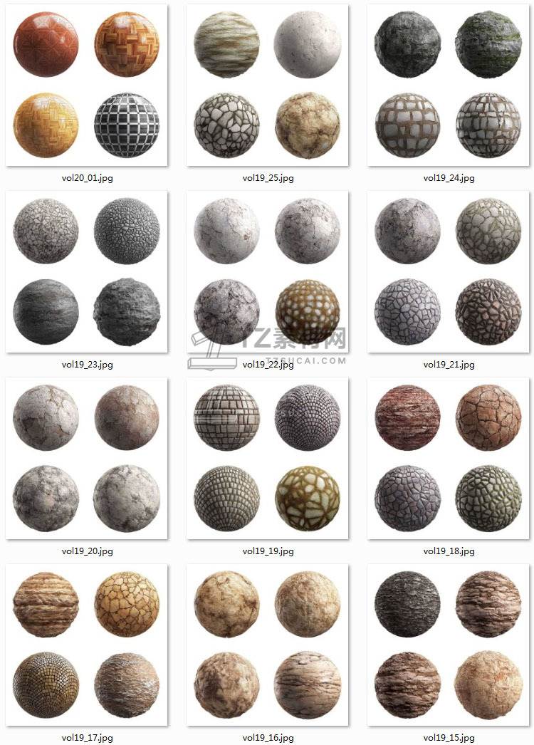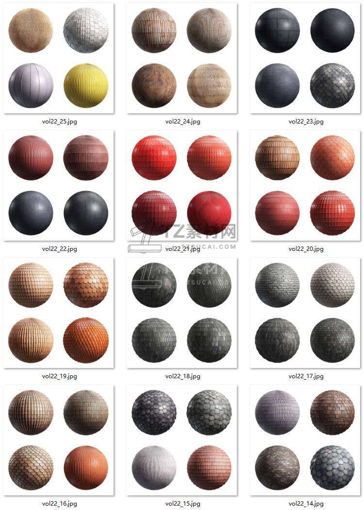 vol.18-vol.20,vol.22每套贴图有7个贴图,【diffuse漫反射贴图】,【glossiness光泽度贴图】,【height高度贴图】,【normal法线贴图】,【reflection折射贴图】,【ao贴图】,【roughness凹凸贴图】,
