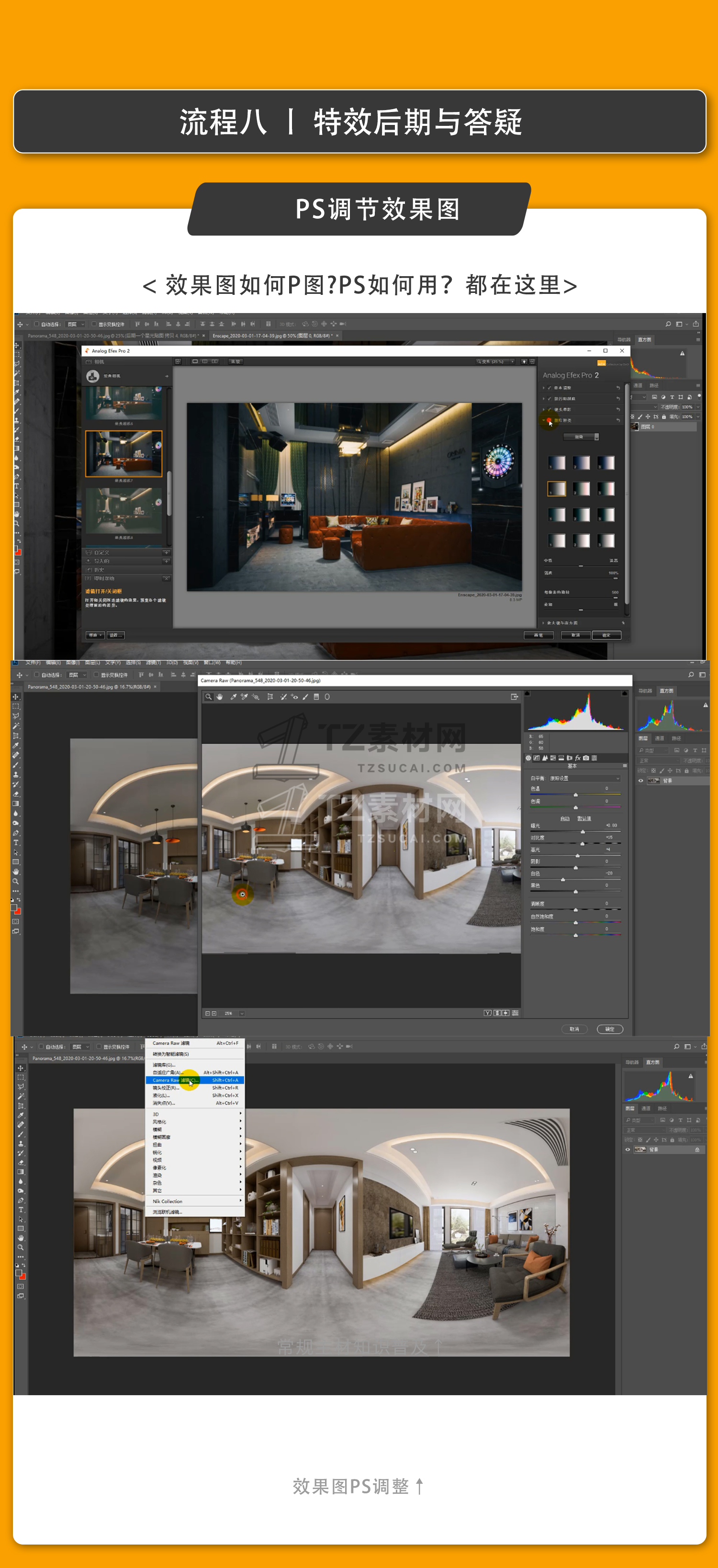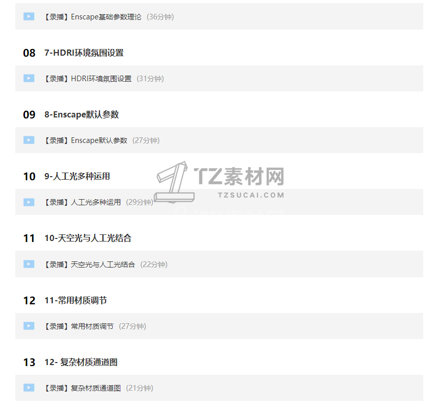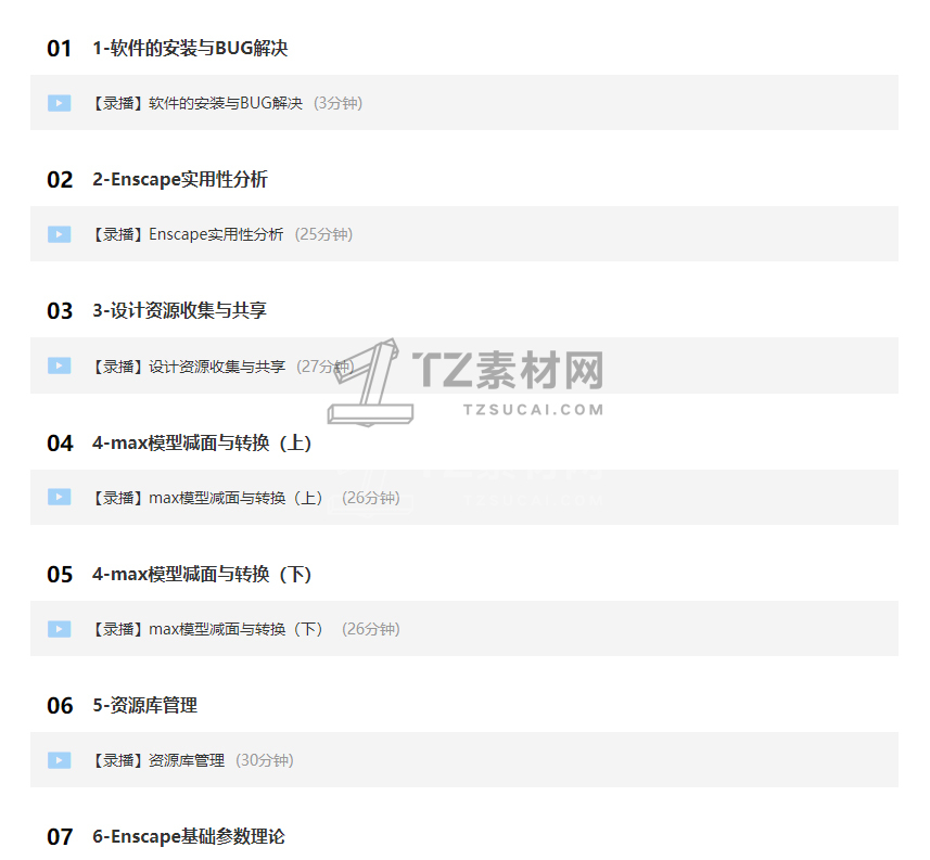 课程从软件安装到max软装减面与转换,再到渲染出图,渲染动画,镜头选择,再到最后的ps后期,AE特效,深入的介绍了一套完整的enscape工作流程。
