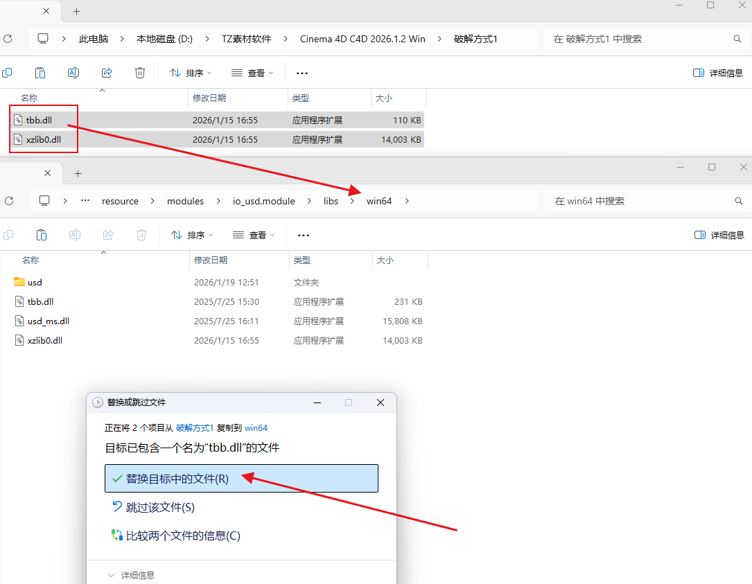 拷贝破解文件1里面的tbb.dll和xzlib0.dll到C4D安装目录下默认