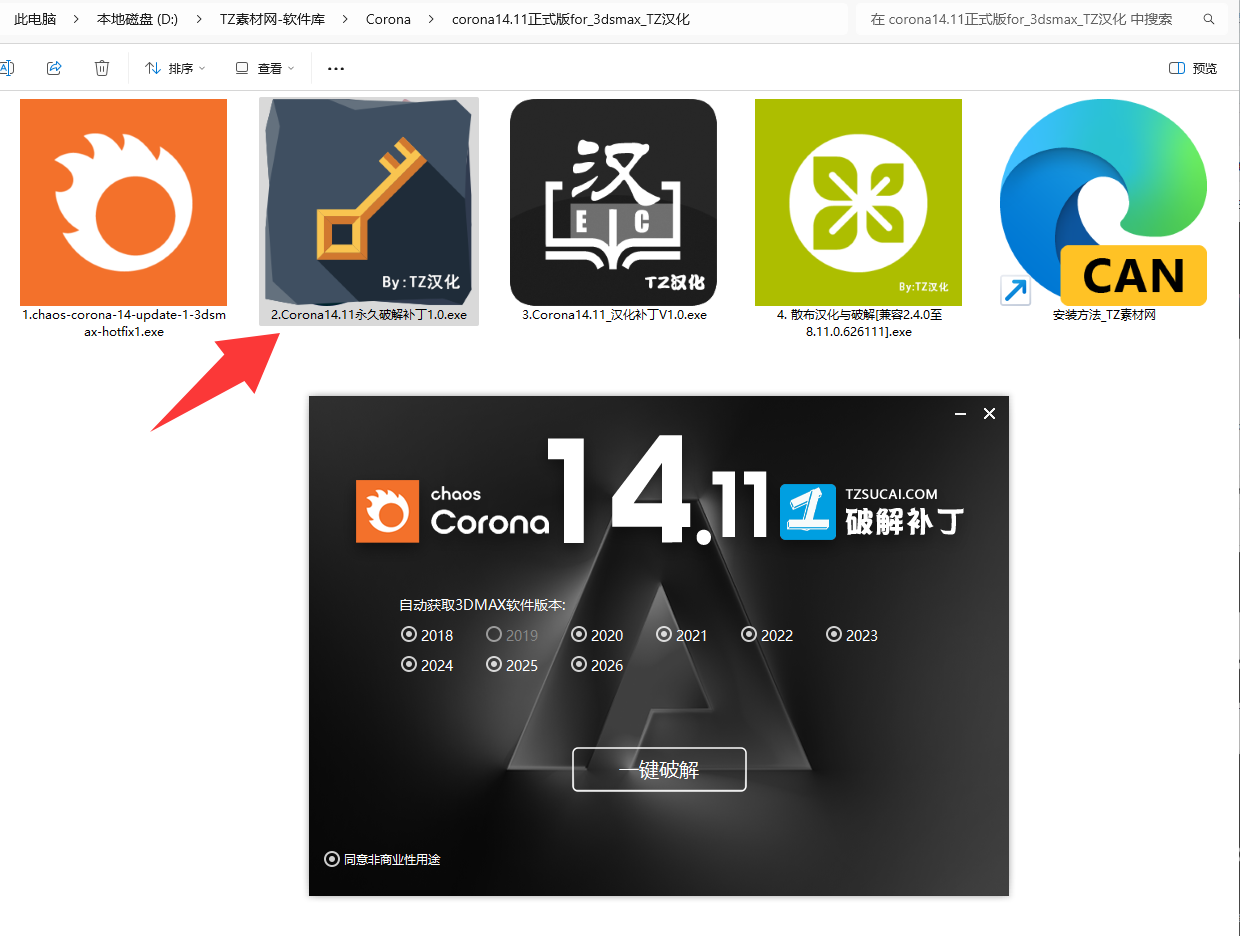 可以使用右键管理员方式运行:2.Corona14.11永久破解补丁.exe