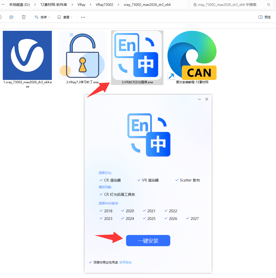 ① 此汉化补丁是通用的,CR渲染器兼容 2018~2027版本, VR渲染器兼容 2022~2027版本,Scatter散布 兼容2018~2027版本。