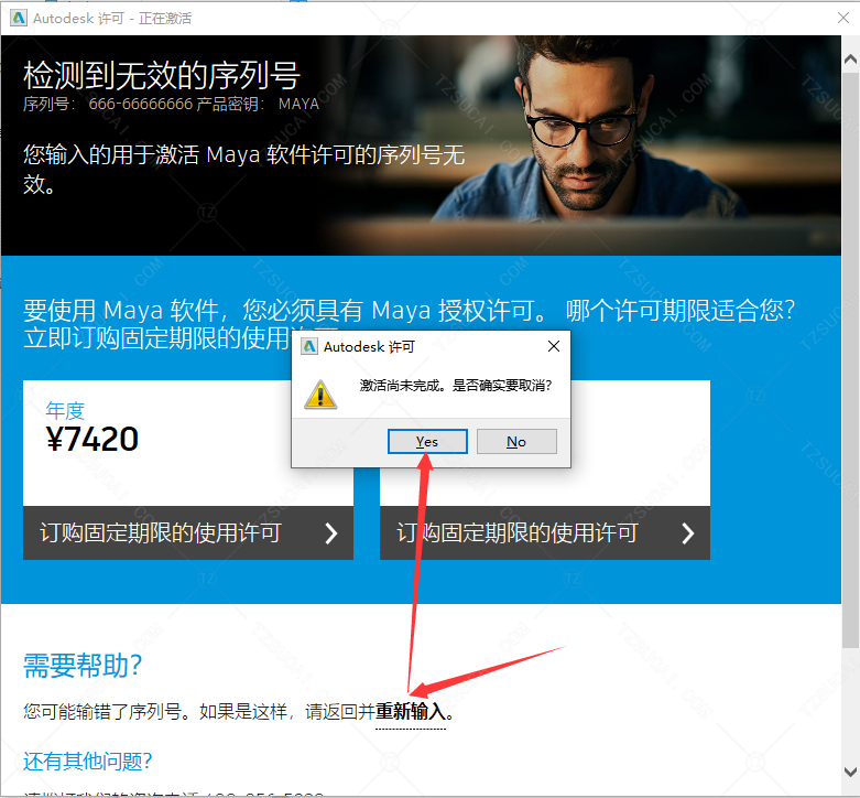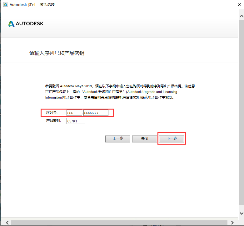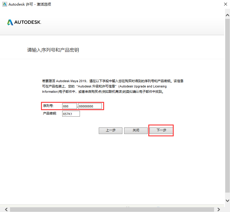 13、再次输入maya2019序列号,小编选择666-69696969,657K1;