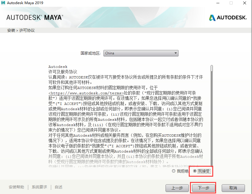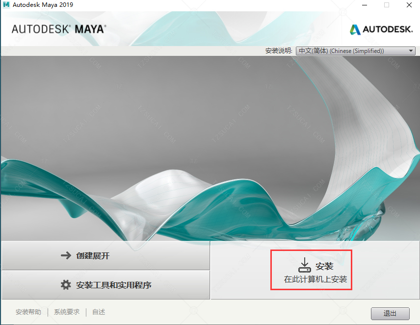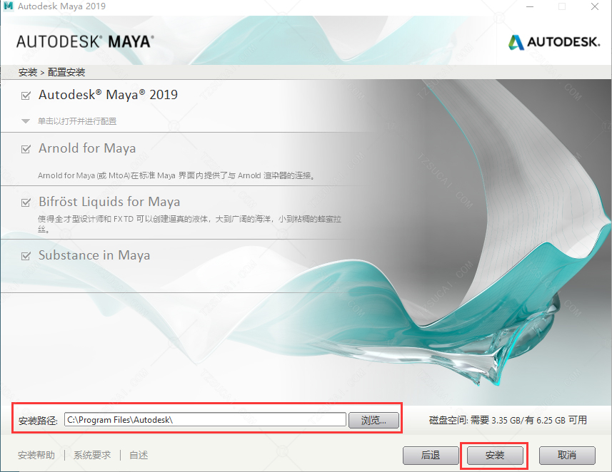 2、双击文件“Autodesk_Maya_2019_dlm.sfx.exe”开始解压安装,默认目录为C:Autodesk;