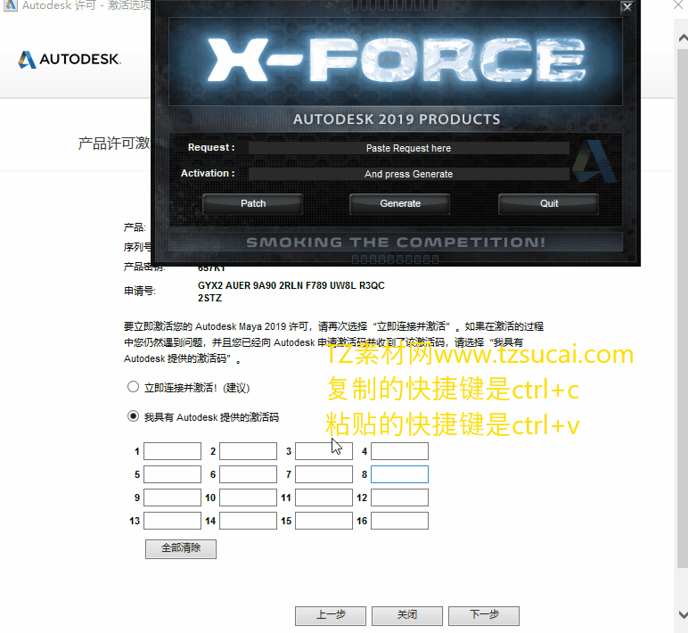 17、复制申请号到注册机中的request框中,再点中间的generate按钮,生成激活码后,复制激活码到软件注册框,再点下一步即可成激活;