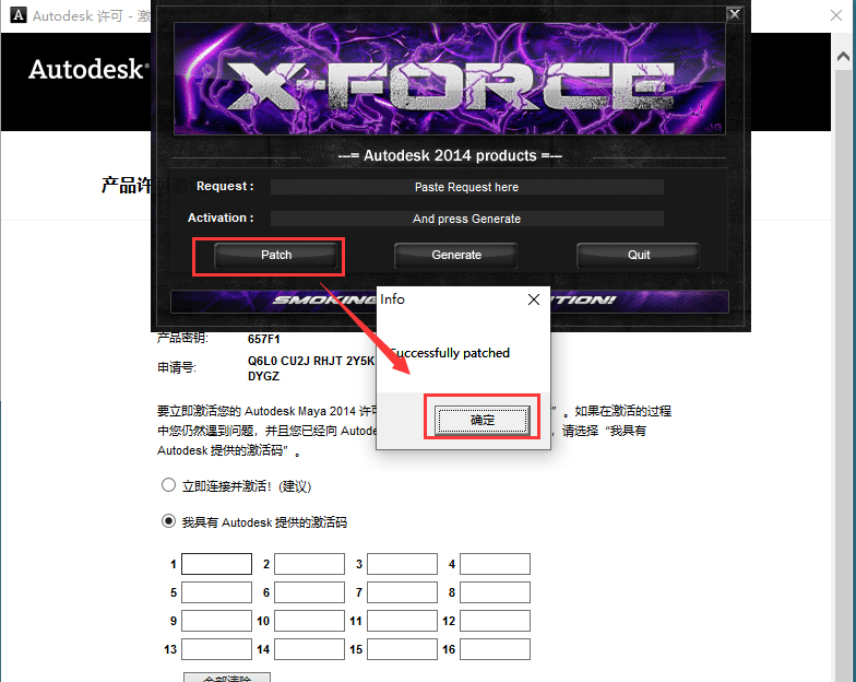 4、打开xf-adsk64.exe 点击 “Patch”后,输入序列号,点击“Generate”;