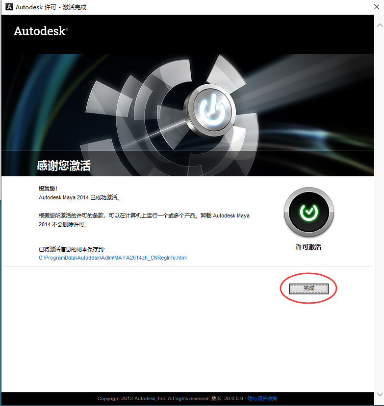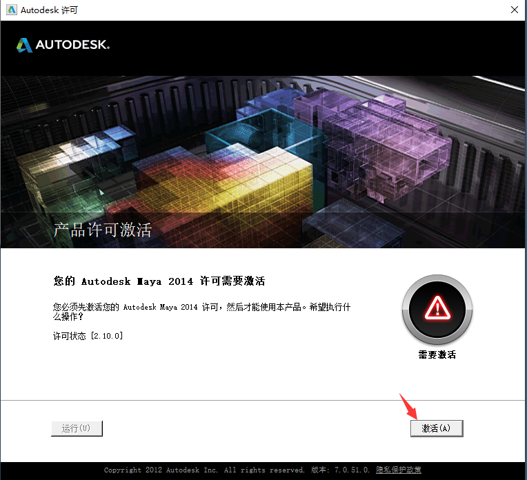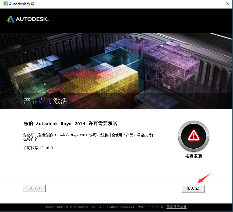 2、打开 Maya 2014 点击右下角的“激活”按钮;在出现的对话框中点击关闭;