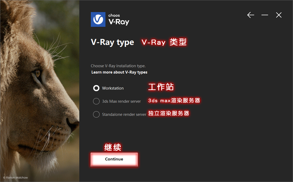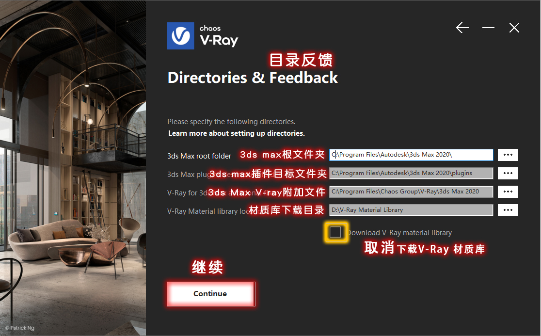 这里先“取消”勾选下载V-Ray 材质库,我们安装完成后在去单独下载材质库。其他的可以保持默认然后点击继续