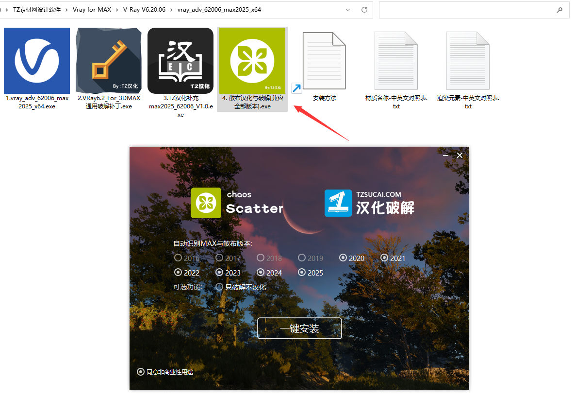 如果您不需要散布;无需安装下方散布的破解与汉化;如果需要,可双击“4. 散布汉化与破解[兼容全部版本].exe”并点击“一键安装”